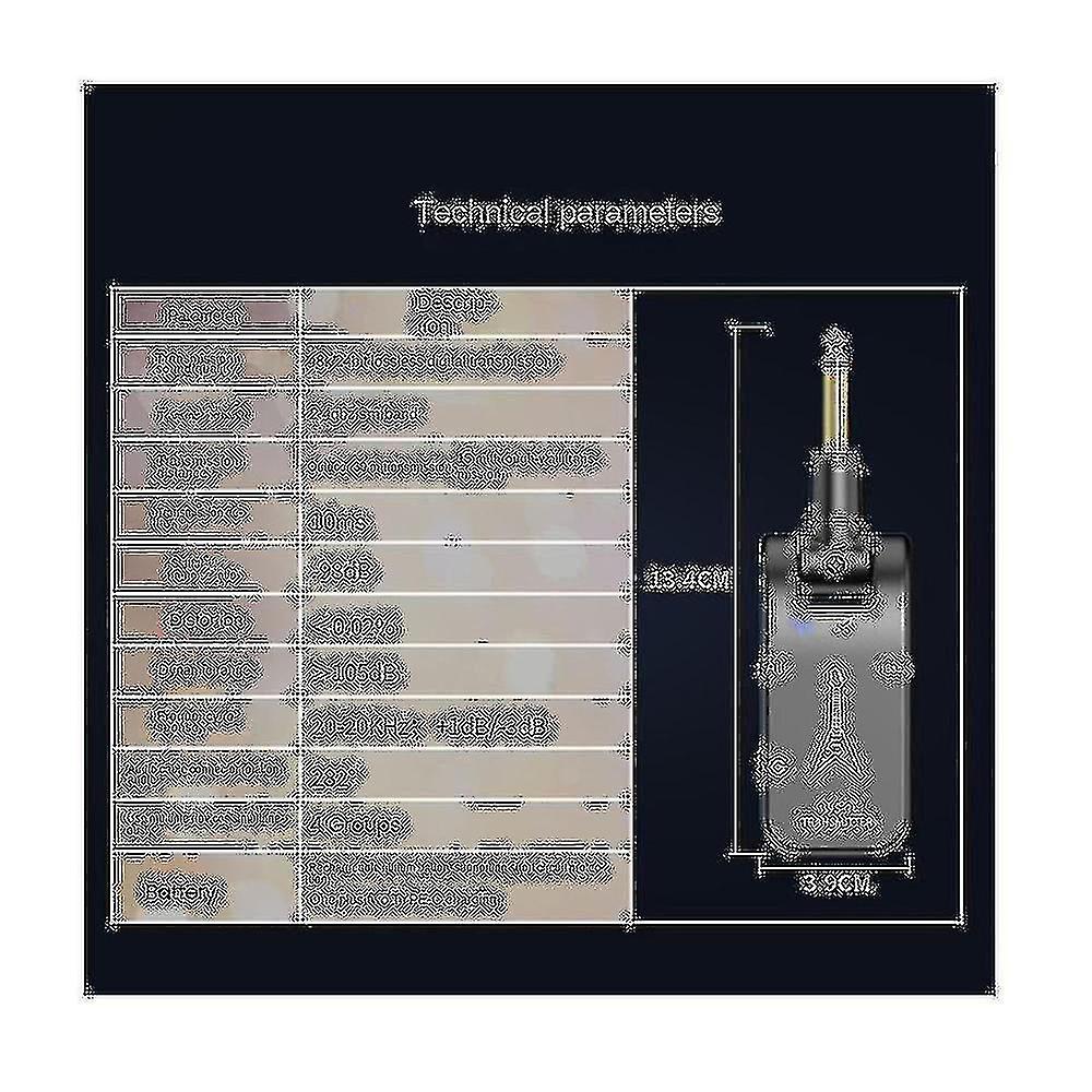 range:Greater than105dbFrequency response:20-20KHz; +1db/-3dbRotation angle of audio head:280Simultaneous use of multiple devices:4 groupsBattery:Rechargeable lithium battery that supports short circuit for protection, one with two TYPE-C chargingColour:BlackMaterial:ABSPackage Contents:1 * Guitar System Transmitter1 * Guitar System ReceiverOnly the above package content, other products are not included.Note:
