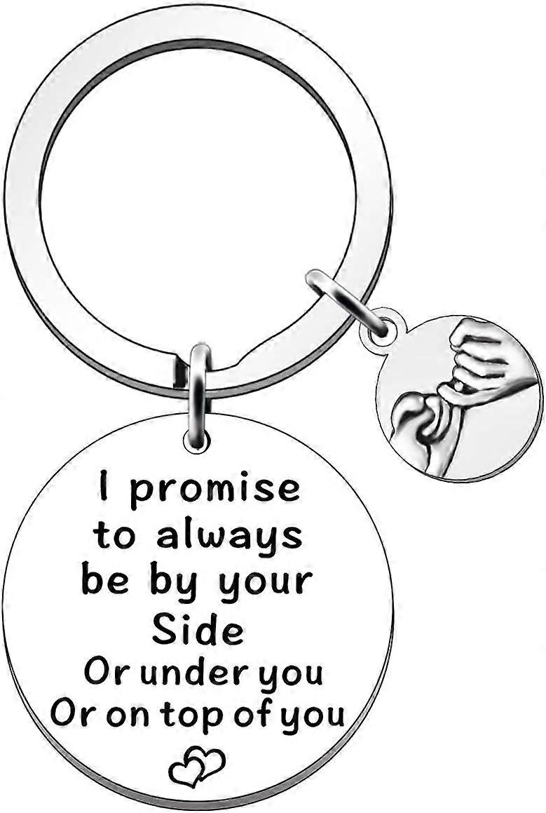 Funny Couple Keyring Gifts: Stamped with the words "I promise to always be by your side. Or under you. Or on top of youA wonderful and funny way to show your special love to your loves one. Valentines Day Gifts: Romantic gifts for your boyfriend girlfriend husband wife lovers on Valentines Day, Anniversary, Birthday, Christmas or any other special moment, to express your strong love for him or her. High Quality Stainless Steel Keyring: no deformation, nonallergenic, no fading, hard, bright, injury-free green environmental material. Exquisite Brand Gift: It not only can hold your keys, but also as a great decoration.