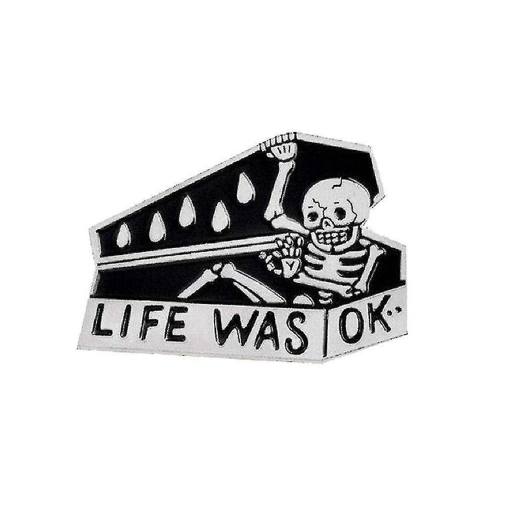Exquisite craftsmanship unisex brooch with skull in coffin and "Life was ok" letters print design.Unique and funny clothes decor to make your attractive and eye-catching.Easy matching your daily outfits like shirt, denim, sweater, jacket, collar, etc.