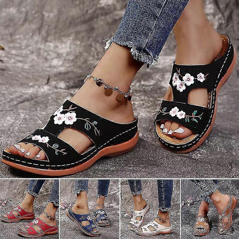 leather flower embroidered vintage casual soft footbed orthopedic arch-support sandals