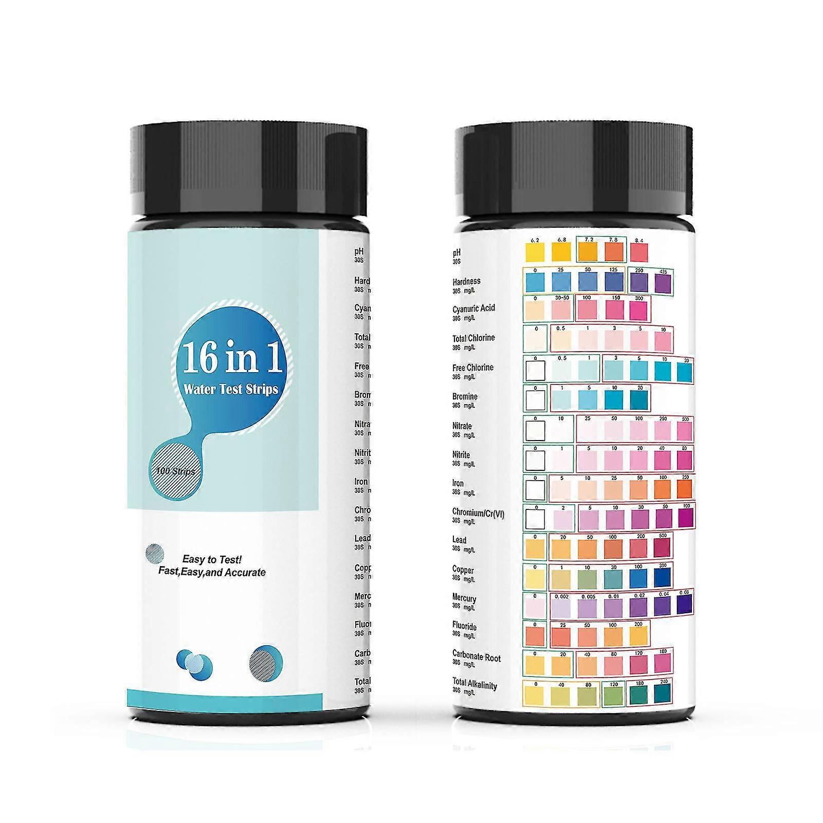 Features:Comprehensive Testing: Our premium drinking water test kit includes 100 strips with 16 tests in 1, allowing you to test for a wide range of contaminants including hardness, pH, lead, iron, copper, chlorine and more, ensuring your water is safe and healthy to drink.Easy to Use: Our water testing strips are incredibly easy to use, simply dip the strip into your water sample and wait for the results. The strips are color-coded, making it easy to interpret the results and understand what contaminants are present in your water.Reliable Results: Our water testing strips are designed to provide accurate and reliable results every time, ensuring that you can trust the information they provide. This makes them an essential tool for anyone who wants to ensure that their water is safe and healthy to drink.High Sensitivity: Our 16 in 1 high sensitivity test strips are designed to provide accurate and reliable results, detecting even trace amounts of contaminants in your water. This makes them perfect for testing well and tap water purity, as well as aquariums and pools.Versatile: Our water testing strips are suitable for testing a wide range of water sources, including tap water, well water, pool water, and aquarium water. This versatility makes them an essential tool for anyone concerned about the quality of their water.Notice:Actual color may be slightly different from the image due to different display and light effect.Please allow 1-3cm deviation due to manual measurement.Specifications:Shelf life: 1 yearMaterial: PETAccuracy: 96%Test elements: Total alkalinity, pH, total hardness, cyanuric acid, total chlorine, residual chlorine, residual bromine, nitrate, nitrite, iron, chromium, lead, copper, mercury, fluorine, carbonateScope of application: Used for drinking water, household faucets, water purification, swimming pools, and more.Test time: 30sTesting method:1. Immerse the reaction area of the test strip into the solution to be tested for 1-2 seconds, remove the test strip, and drain excess water from above.After 2.30 seconds, compare the color of the reaction area of the test strip with the color chart to determine the test value of the solution to be tested.3. The color comparison time should be controlled between 30 seconds and 60 seconds. If it is too long or too short, it will affect the reading value.Water quality sampling requirements:1. Take 5-10ml of sample water, let it stand still, and then take the supernatant for testing2. The test is conducted at a room temperature of around 25 degrees Celsius.Storage conditions and validity period:1. Storage conditions: Store in a dry place at 2 to 30 away from light (stored at 2 to 8 ).2. Product validity period: Store in a dry place at 2 ~30 away from light, and the validity period is 24 months.3. Bottle opening validity period: After opening, the cylinder cover needs to be sealed and stored in a dry place at 2 ~30 away from light. The validity period is 12 months.1 Bottle * Test Strips (100pcs inside)