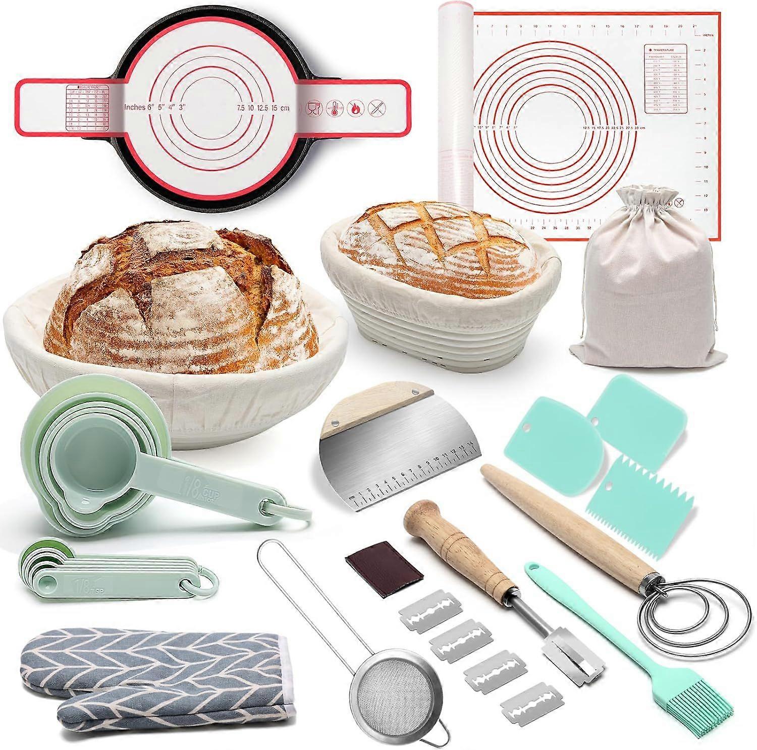 Package Includes 18Pcs:sourdough kit of sets 18 include 10in Round Baskets,9in Oval Baskets,Stainless Dough Scraper,Bread Lame+5Blades+Leather Cover ,Silicone Brush, 2 x Linen Liners,3 x Plastic Scraper,Baking Mat, One Hand Oven Gloves,String Bag,Bread Sling ,Large Measuring Spoon,Small Measuring Spoon,Dough Whisk,Fine Mesh Strainers, 18pcs is perfect help you to finish homemade bread.Heating Resistant Silicone Bread Sling:sourdough silicone bread sling can use up to 480F. it's made of silicone and fiberglass, ensure uniform heat distribution for perfectly baked bread. Safety use in dutch oven and electric oven with longer life.the durable longer handles will protect your hand to prevent burnt.Premium Natural Rattan:The sourdough basket are handmade with no bleaching,BPA free, surface smooth, non-stick,no splinter,you can make safe and taste bread for your family, creating a crispy crust after baking. easy to wash,use the linen liner for even easier cleaning.Best Present:The sourdough bowl is ideal choice for handmade loaves, artisan breads,you can enjoy process of making bread, or share the fun of making bread with your family, it's also perfect gift for your friends or family who loves make bread.Spiral Pattern Bread With Perfect Taste:The bread proofing basket are made of natural Indonesian rattan which create a spiral pattern on your bread, it has strong water absorption and great breath ability, and can effectively absorb excess moisture, allows the dough to keeping temperature and fermentation for enhancing the dough's texture.