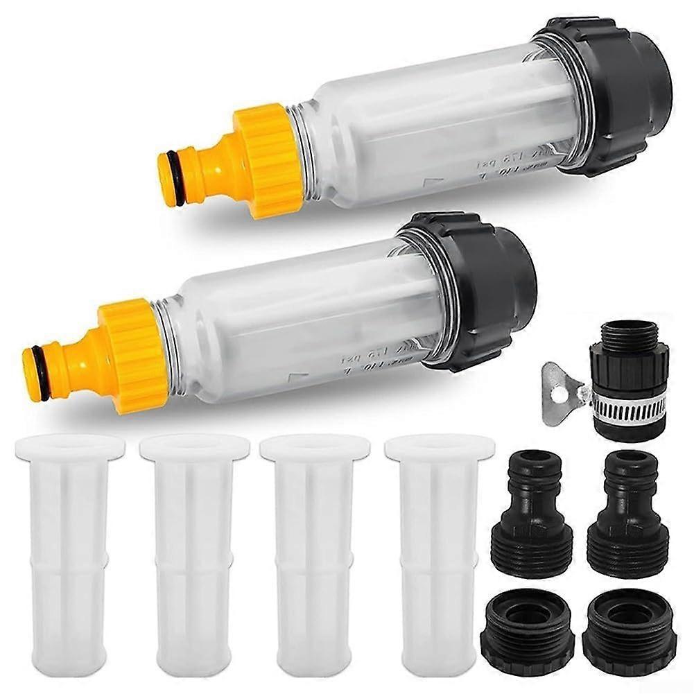 Complete Filter Set with Spare Parts AllInOne Kit includes a full filter assembly, two intermediate filters, and four black connectors, providing ample replacement parts for versatile outdoor use. Durable ABSPET Construction Made from quality ABS and PET for stability and longlasting performance. Effectively blocks dirt particles in water to protect pressure washer pumps and equipment from damage. Transparent Design for Easy Cleaning Clear housing allows visual inspection of water flow and filter condition at a glance. Disassembles easily for tool rinsing when clogged. 3/4 Inch Universal Compatibility Fits most pressure washer inlets, outdoor taps, and standard garden hoses. Snapon coupling design provides tight, reliable attachment with minimal pressure. Key Benefits Protects your equipment by filtering dirt and debris before they reach the pump. Includes spare parts to keep your setup ready for use with minimal downtime. Easy maintenance with a transparent housing and tool rinsing when needed. Quick, leak connections with universal 3/4 inch compatibility. Use Scenarios Car, motorcycle, or ATV cleaning: Attach to a garden hose or pressure washer inlet to filter incoming water and protect the pump during vehicle washing. Outdoor surface cleaning: Use for decks, patios, driveways, and siding to keep dirt from entering the pump while you clean. Yard equipment maintenance: Clean lawn mowers, garden tools, and trailers by filtering muddy or dirty water before it reaches the pressure washer.