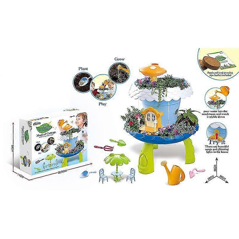 Material: plastic/plastic Colour: Blue, Pink Size: Shown on pictures Specification: 1. Fairy garden magical cottage! plant and grow your own magic garden using the included soil and seeds and watch it grow. 2. Kids Gardening tools set includes everything you need a shovel, trowel, garden toy rake, water can this toddler gardening set features fairy garden accessories: 2 flowerpot, 2 soils, toadstool reusable cottage garden toy for continuous growing fun. 3. Kids craft learning toys develops important STEM skills. Kids will love planting and watching their own little garden grow check in on your garden every day watch as the seeds develop into mature plants. Water it as needed and make sure it gets sunlight too. Great outside toys for kids. 4. Fairy house kit with charming details moving doors, 2 street lights, pink umbrella table with 2 pink chairs relax at the fairy garden with the beautiful songs and glittering lights in the house! 5. Fairy garden kits for girls and boys ages 3 and up. kids plant growing kit instructions included. Package: 2 x flowerpots 3 x brackets 1 x toadstool 1 x tray 2 x soil 1 x watering can 1 x seed packet 4 x gardening tools 2 x chairs 1 x umbrella table 2 x steetlights 1 x girl 1 x unicorn 1 x instructions packet Package List: 1 X Play Fairy Garden Kit