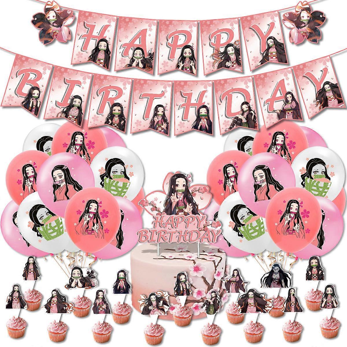 Demon Slayer Nezuko Theme Party Decorations Children's Birthday Flag Cake Card Balloon Set Arrangement Perfect Gift-1