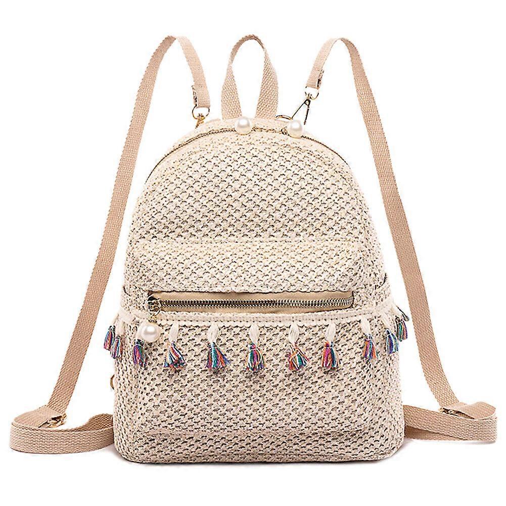 Straw Woven Womens Backpack with Tassel, Summer Beach & School Bag, Beige