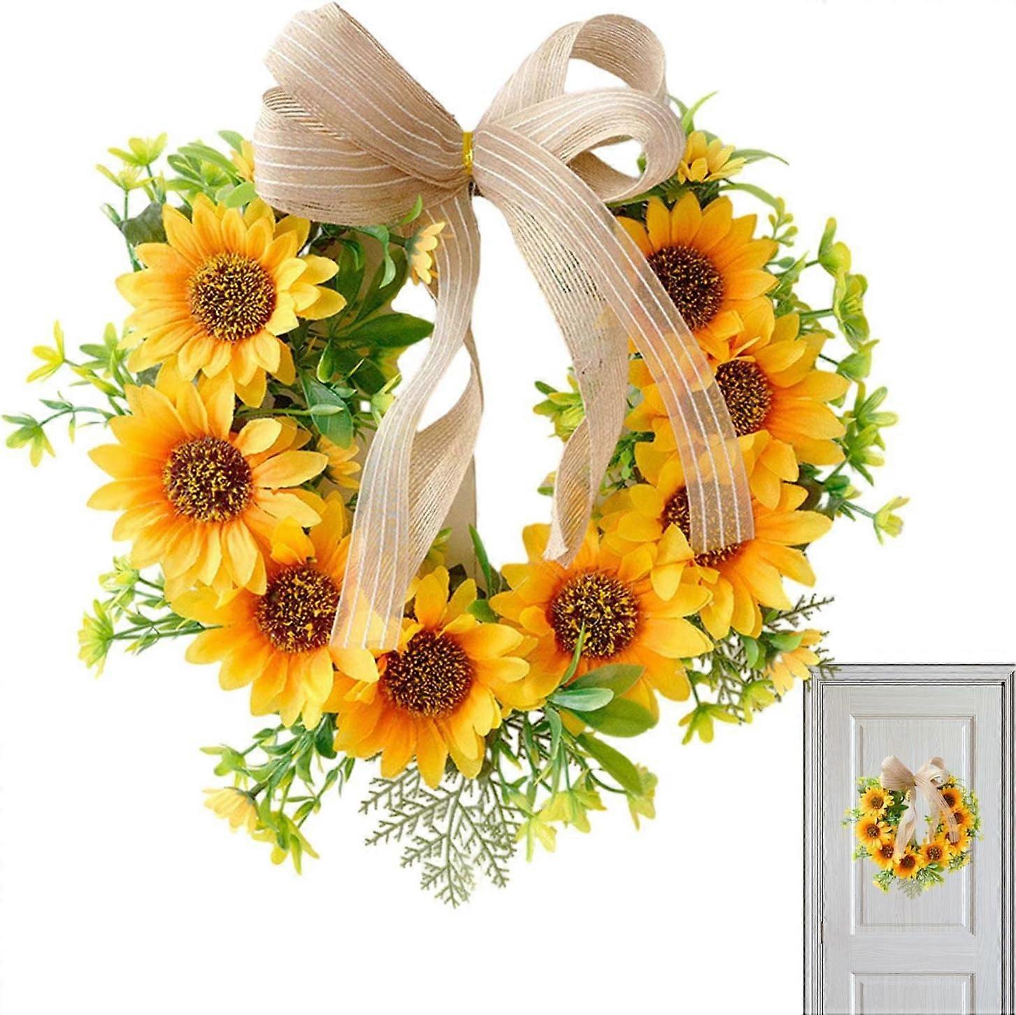 Yellow Sunflower Wreath, 15.7-Inch Summer Door Decor with Bow and Green Leaves
