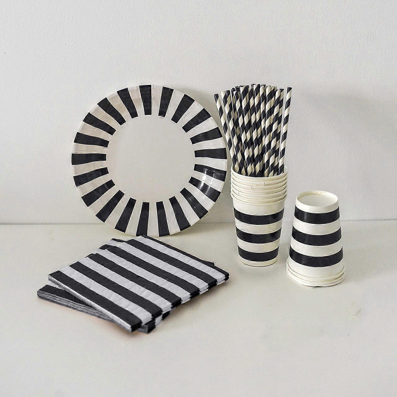 12* 9-inch 23cm round black stripes, 12* paper cups black horizontal stripes, 20* tissue paper black horizontal stripes, 25* paper straws black style random Birthday Party Plates and Cups Set: The birthday tableware set can help you light up the beautiful party and make an unforgettable moment for your family, friends and yourself. Happy 18th 20th 21st 25th 30th 31st 35th 40th 50th 60th 70th 80th birthday decorations. Food Grade Material: The party tableware set is 100% food grade. Plates, cups and napkins are made of eco-friendly and recyclable paper, anyone can use it with confidence. Plates are thick and rigid and won't fold while carrying food. Napkins are soft and absorbent, a pleasure to use. Note: Please don't microwave the plates and cups. Convenient and Save Time: Get the black white plates cups napkins set to make an indoor or outdoor black white themed party that impress your guests the entire. Very nice for table decoration, very light and easy to carry to outdoor. The black white party decorations tableware set is ideal for snacks, desserts, skewers, candies, cakes, vegetables and many other foods. You can clean up the scene quickly after each gatherings. And you have more time with your family and friends. Black and White Party Decorations: The black white disposable party tableware set suitable for men bowomen girls birthday party, graduation party, bachelors party, engagement, bridal shower, wedding, baby shower, anniversary, cocktail party, outdoor barbecue, camping, picnic, garden party, carnival, Valentine's Day, Easter, Halloween, Thanksgiving, Christmas, New Year's Day and more.