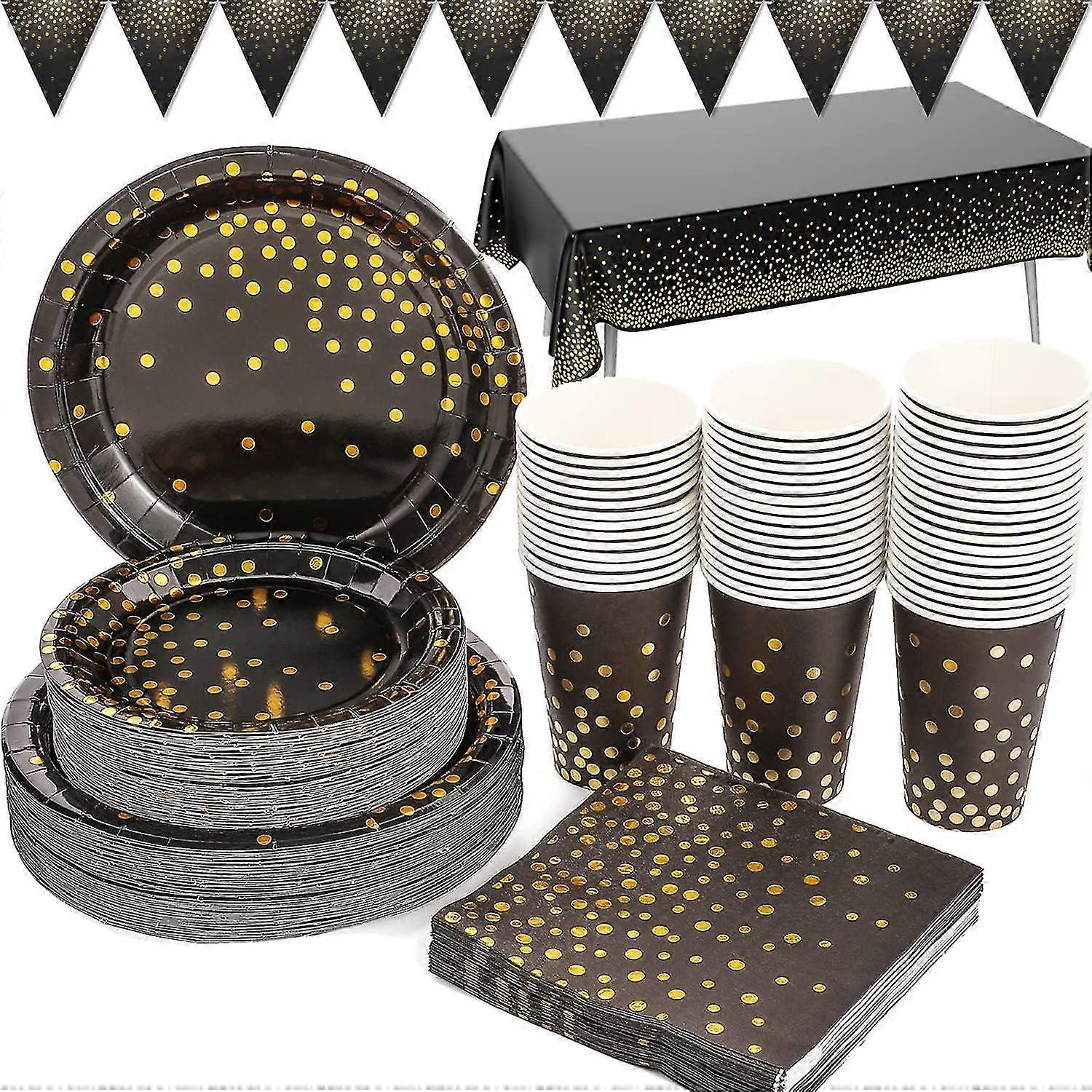 Black and Gold Party Supplies 66 Pieces Party Tableware Includes Paper Plates,Napkins,Cups,Tablecloth,Banner,for Birthday,Party
