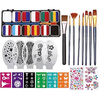 フェイスペイントキット、15カラーフェイスペインティングパレット+ 2ブラシ32ステンシル