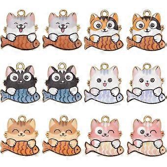 1ボックス24個6色猫魚チャーム猫チャームバルク金合金エナメルプリントマテル動物ペットキティチャームジュエリー作りチャーム用品DIY C