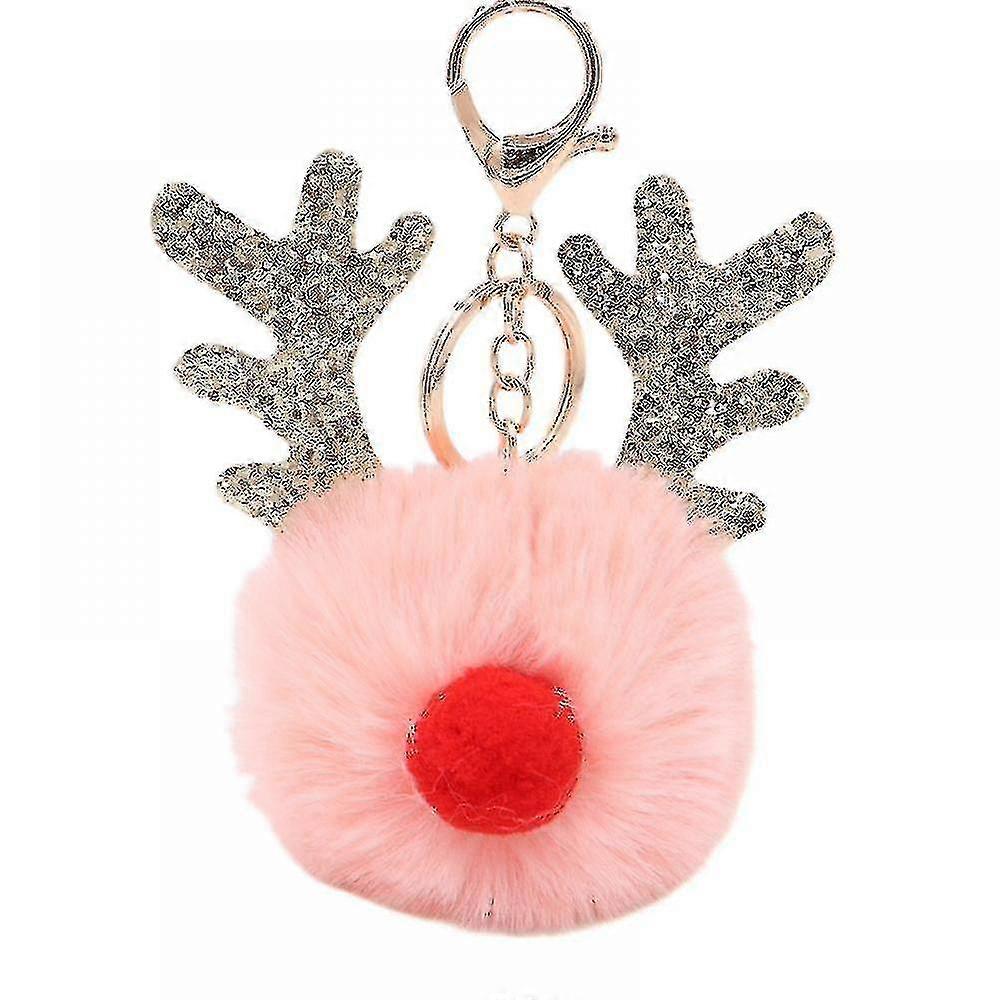 Keychain - Cute Reindeer Pompom Purse Accessory - Fluffy Christmas Pom Pom Key Chain - Plush Holiday Animal Purse Charm - Stylish Gift (light Pink)