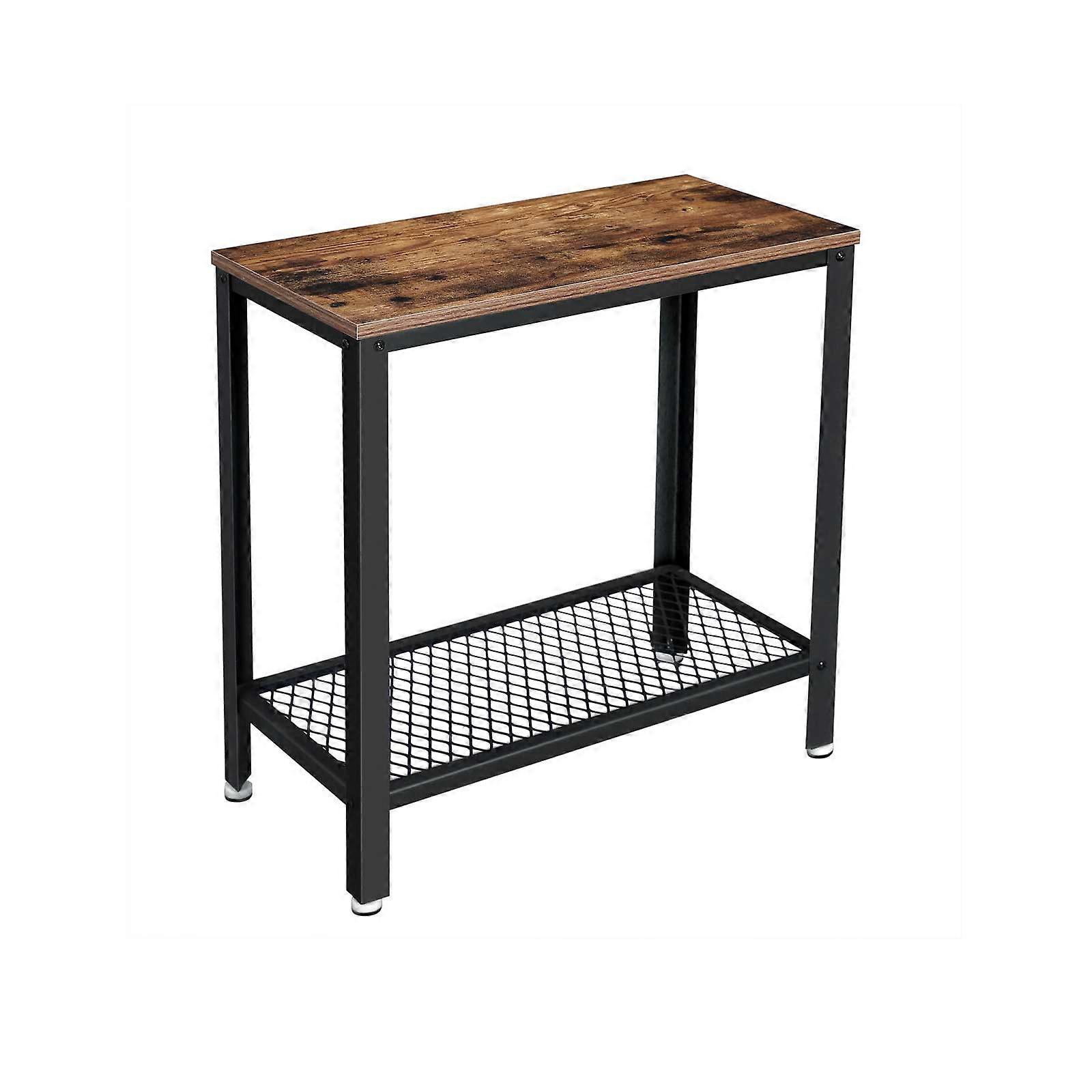 Homestorecity Bijzettafel, Nachtkastje, Salontafel met Netplank, Salontafel, Stevig, Eenvoudig te Monteren, Ruimtebesparend, Woonkamer, Slaapkamer, Industrieel Design, Vintage Bruin en Zwart - Een beetje vintage hier, een beetje industrieel design daar. De stijl van deze bijzettafel kan worden omschreven als een compositie van een stalen frame, dat de trendy industriële look uitstraalt, en een nauwkeurig vervaardigd vintage houten blad. Het praktische metalen net voegt een speciaal tintje toe en biedt een stijlvolle opbergruimte voor tijdschriften, planten of andere spullen. Het resultaat is een spannend visueel effect en een meubelstuk dat tegelijkertijd robuust, aantrekkelijk en functioneel is. Kleine tafel, groot nut. Als u op grijze, regenachtige dagen graag op de bank of in bed kruipt met een goed boek en een kop warme chocolademelk, dan is deze eenvoudige bijzettafel precies wat u zoekt. Plaats uw drankje en kleine hapjes erop, zodat u de chocolademelk en koekjes niet op uw maag hoeft te balanceren terwijl u uw favoriete misdaadroman verslindt. De smalle salontafel past perfect bij andere meubels uit de industriële designserie van Homestorecity