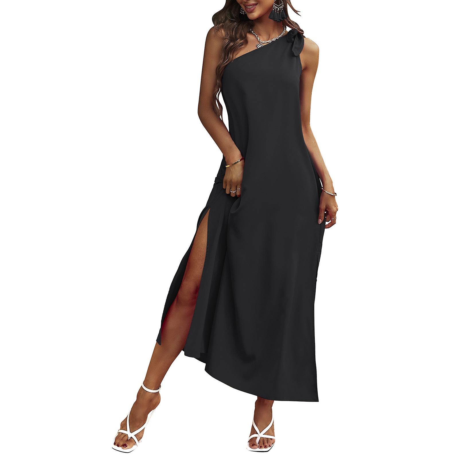 Trendy Black One-Shoulder Dress - Bow Tie Sleeveless Split Hem Loose Fit Party Fashion, L