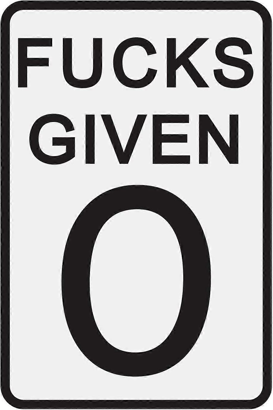 0 Fucks Given speed limit sign measures 12" x 8" Funny sign is white with black trim and lettering and evokes a traffic sign Make a bold and humorous statement when you hang this in your room, dorm, garage or man cave Fucks Given 0 tin sign comes with pre-drilled holes in each corner for no hassle installation