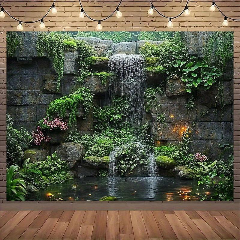 1 waterfall and green plant polyester background banner - Rich stone wall design, interior and exterior decoration