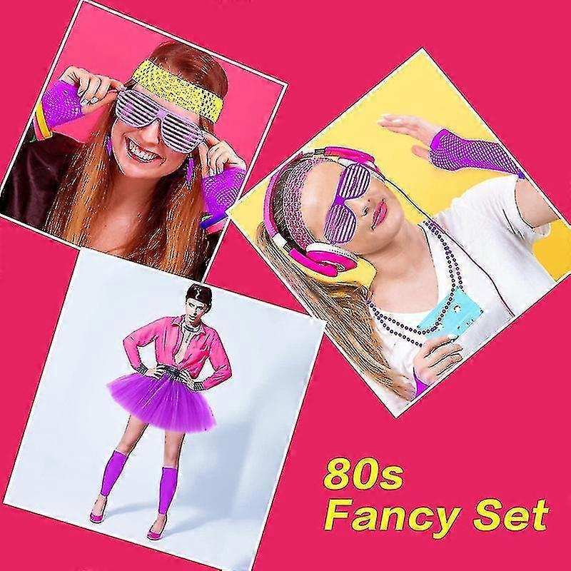 1set, 80s Fancy Dress Costume Accessories Set Women Girls Neon Purple Dress Neon Bracelets Necklaces Glove Lace Bow Headband For 1980s Fancy Dress Par