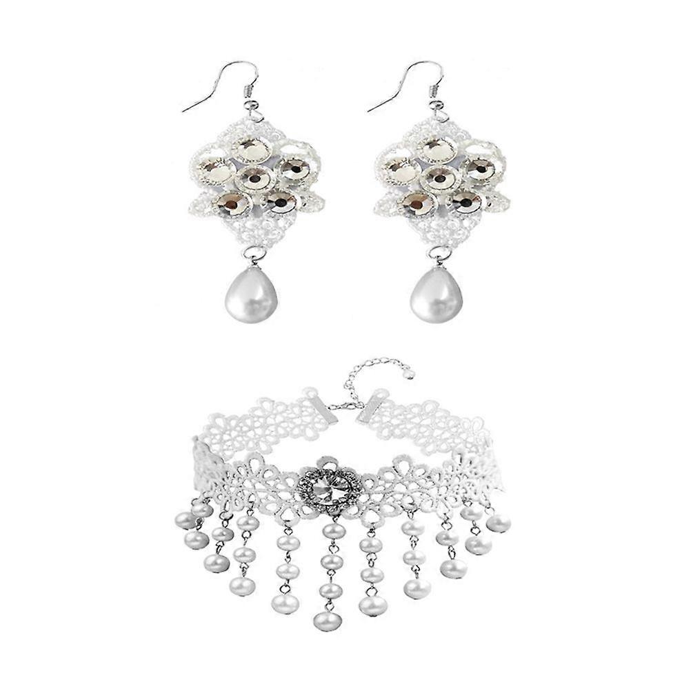 1 Set Wedding Accessories White Pearl Lace Necklace with Pendants Earrings Bridal Jewelry Sets