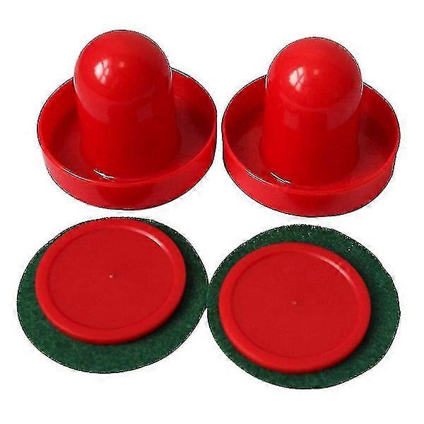 Made of high-quality ABS. Hard and not brittle. The green felt bottom on the striker is very thick. The ergonomic design pickers provide a comfortable feel that enhances the overall gaming experience even in dramatic table games. Suitable for most standard air hockey tables. Take your air hockey game to the next level. Red mallets are approximately: 2.6 inches (65 mm) in diameter. Red pucks are approximately: 2 inches (50 mm) in diameter. Contains 2 pushers with felt and 2 air hockey pucks in 1 set. Upgrade your air hockey game with this premium set! Made from durable ABS material, these strikers and pucks are designed for long-lasting performance. The ergonomic handles provide a comfortable grip, while the thick felt bottoms ensure smooth and fast gameplay. Perfect for any standard air hockey table.