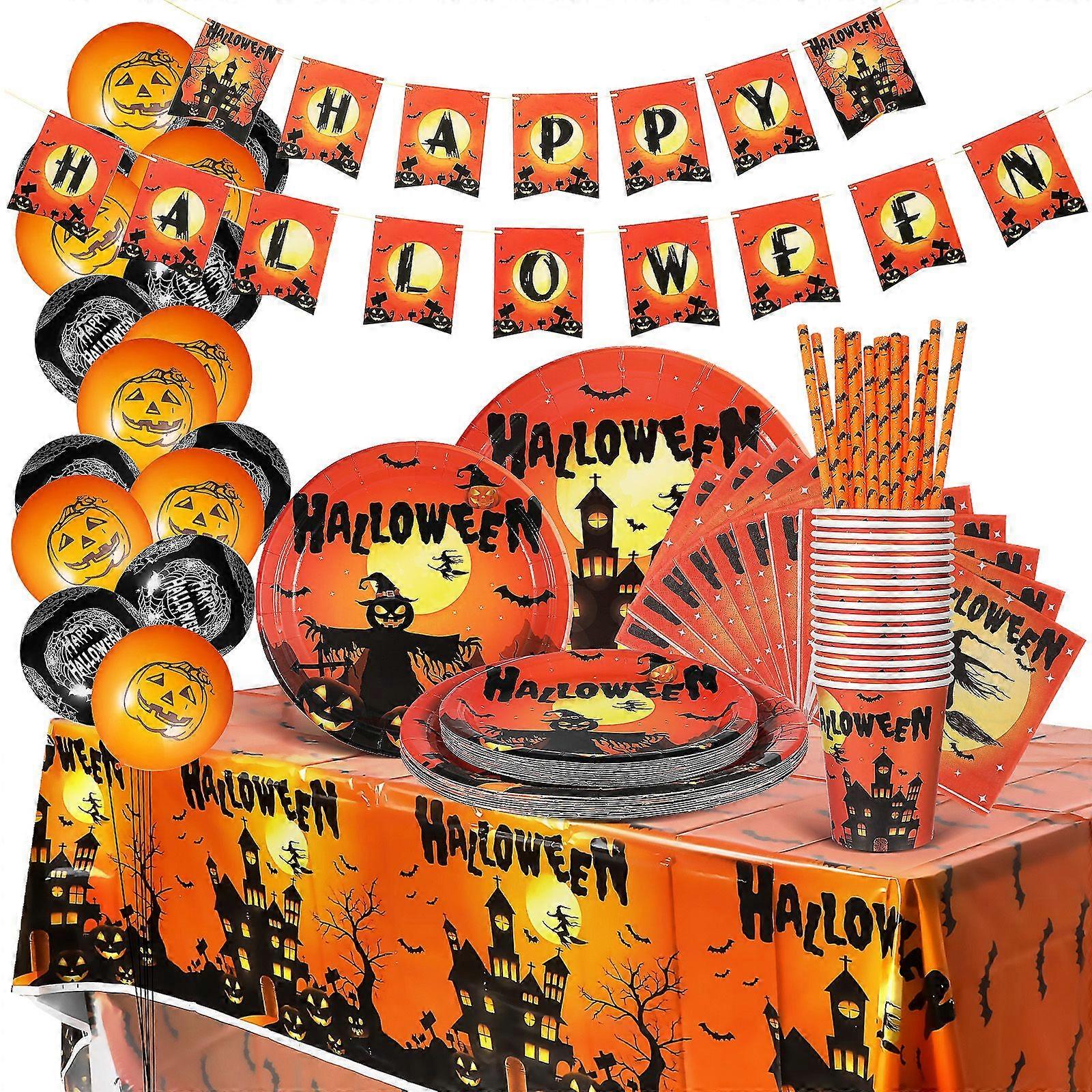 Description Decorate your Halloween party with our Halloween plates and cups kit! This comprehensive set includes enough tableware you need to decorate and serve your guests. Our unique design features Halloween-themed colors and patterns, adding a touch of frightful fun to your party. Features -Color:Assorted color -Material:Plastic, paper -Size: 274.00X137.00X0.10cm/107.68X53.84X0.04in - Rich Set: The Halloween party set includes plates, napkins, cups, banners, and more, providing a plentiful supply to decorate. - Unique Design: Featuring Halloween-themed colors and patterns, this Halloween decor set adds a joyful atmosphere to your Halloween party. - Safe Materials: Made from plastic and paper, the Halloween party supplies are safe and sturdy, designed to withstand single use while ensuring the safety. - Easy Coordination: The various decorations in the set are easy to setup, allowing you to quickly and effortlessly set up your Halloween party. - Versatile Use: Suitable for a variety of settings, including homes, schools, and offices, this Halloween party set adds excitement to any event.Package list: 16 x plate(9 inch) 16 x plate(7 inch) 16 x napkin 16 x cup 1 x banner 1 x table cloth 16 x balloon 16 x straw
