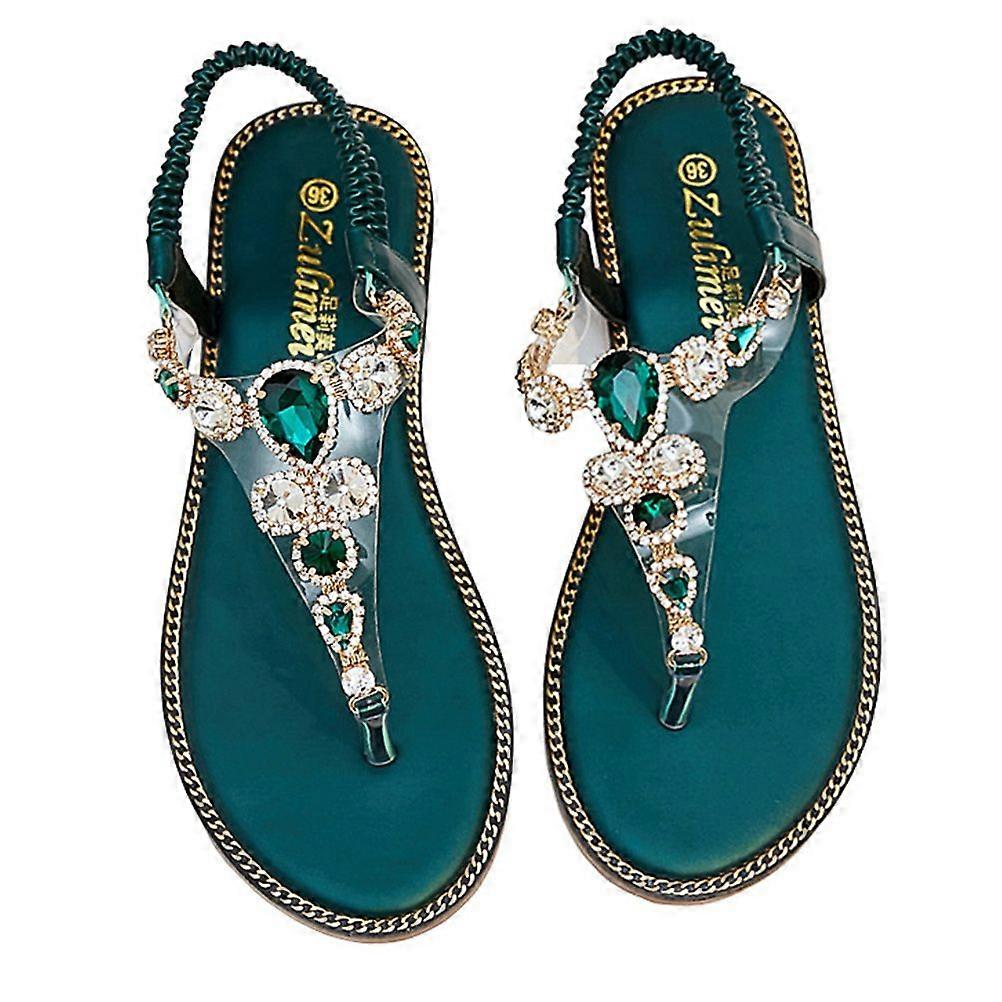 1 Pair Women Summer Sandals Fashion Rhinestone Flat Sandals Bohemia Style Women Slippers for Women Girls (Dark Green, Size 38, 24CM, 7US, 4.5UK, 38EU,