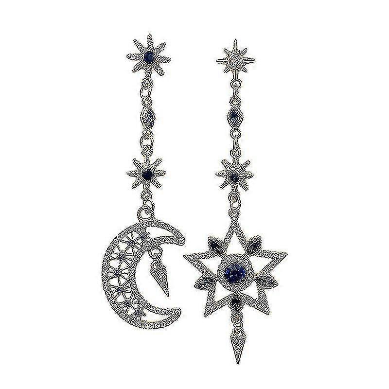 1 Pair Vintage Crystal Moon Star Pendant Earrings Blue Gemstone Long Dangle