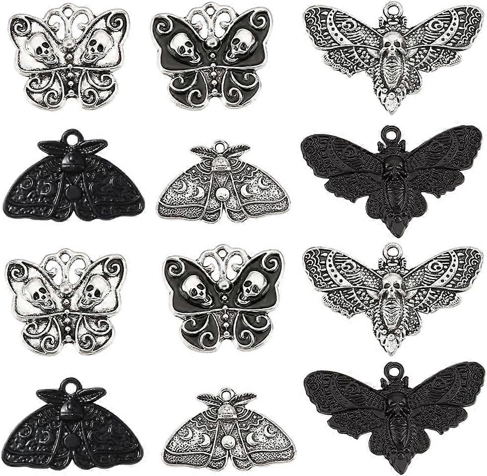 1 Box 24Pcs Moth Charms Gothic Style Halloween Antique Silver Skull Charms Black Moon Phase Moth Insect Charm Butterfly Skeleton Head Charm for Jewelr