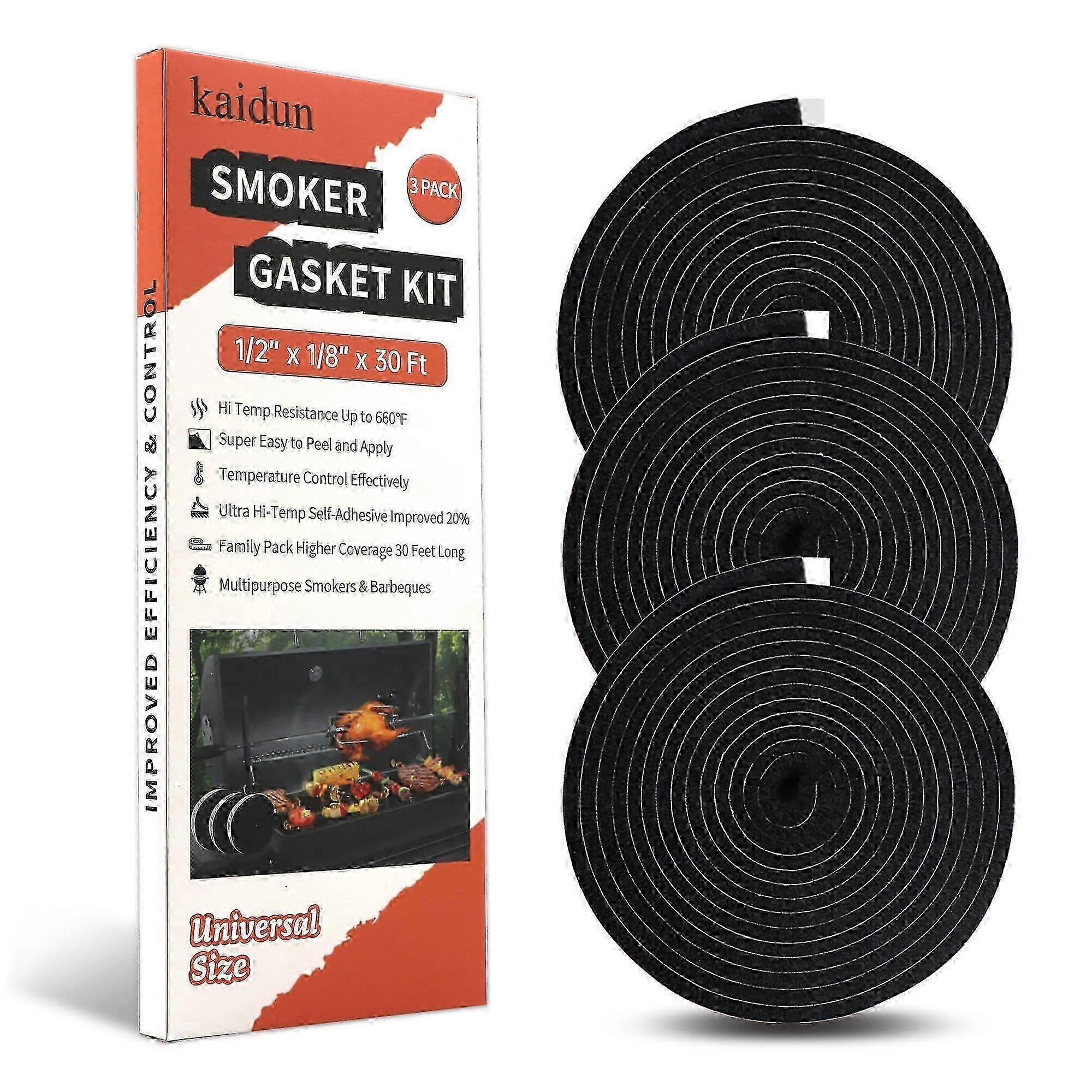 1.[Super Easy to Peel]Our BBQ smoker gasket leaves an extra 1cm of blank area in the initial position so you can peel it off quickly and easily. No more worries about the adhesive backing being difficult to separate from the paper. 2.[Size of Smoker Tape Seal]1/2'(Wide) x 1/8'(Thick), 3 Pcs total 30 ft long. Enough smoker grill gaskets to make it easy to use and replace for you. The BBQ sealing tape is also easily cut to the right length for your smoker. 3.[Prevents Smoke Leakage]The smoker gasket is made of premium fireproof (fire resistant) polyacrylonitrile material that can withstand high temperatures up to 660F. It prevents smoke leaks, better controls the temperature inside the grill and improves cooking efficiency. 4.[Strong Self-Adhesive]Self-adhesive high heat smoker gaskets have better adhesion than others and do not fall off easily after sticking. WARM TIP: Please clean the surface thoroughly before sticking the grill gaskets for better adhesion. Note: Due to the light and screen setting difference, the item's color may be slightly different from the pictures. Please allow slight dimension difference due to different manual measurement.