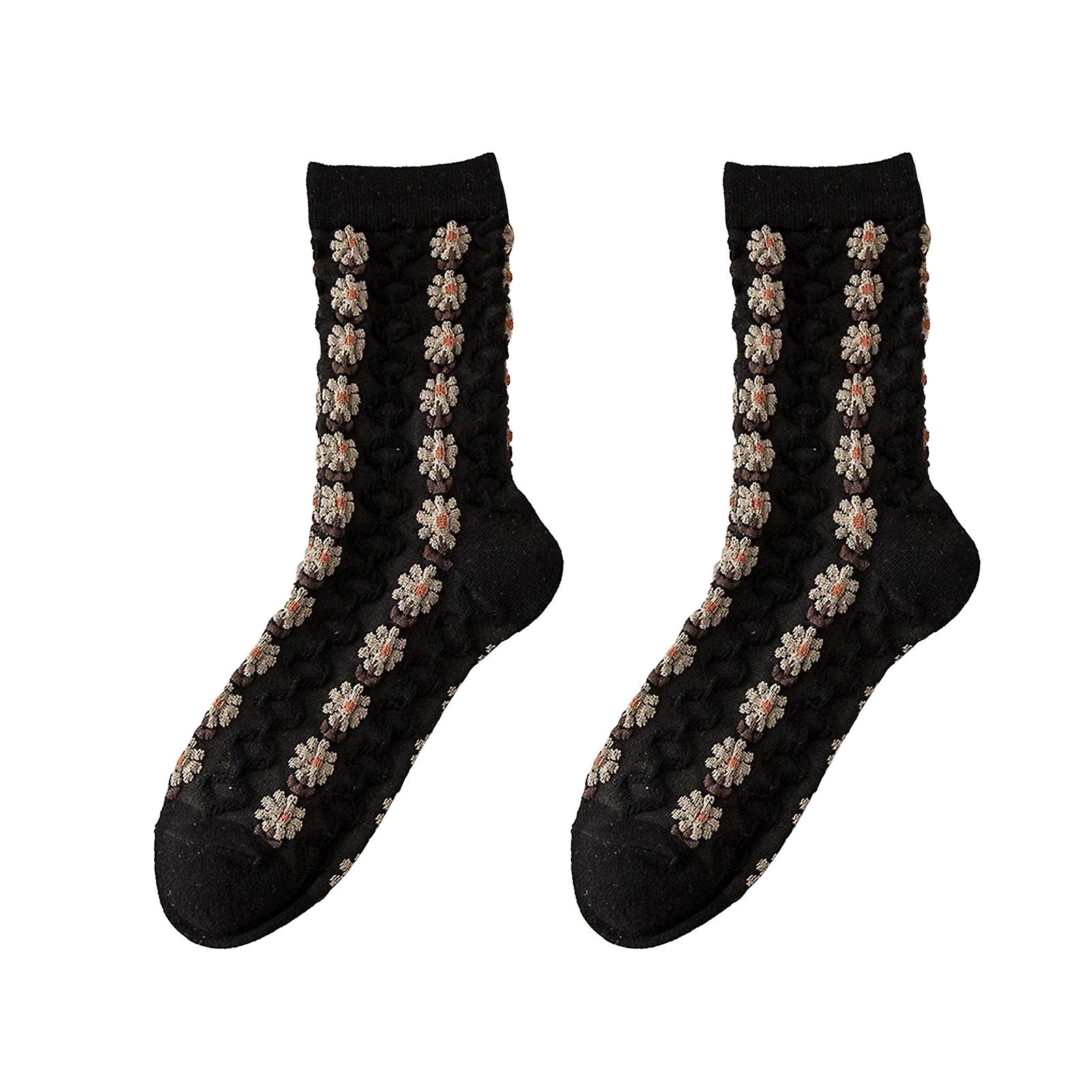 1 Pair Ladies Socks Flower Applique Vintage Forest Style Thick Anti-slip Warm Soft High Elasticity Winter Mid-tube Socks