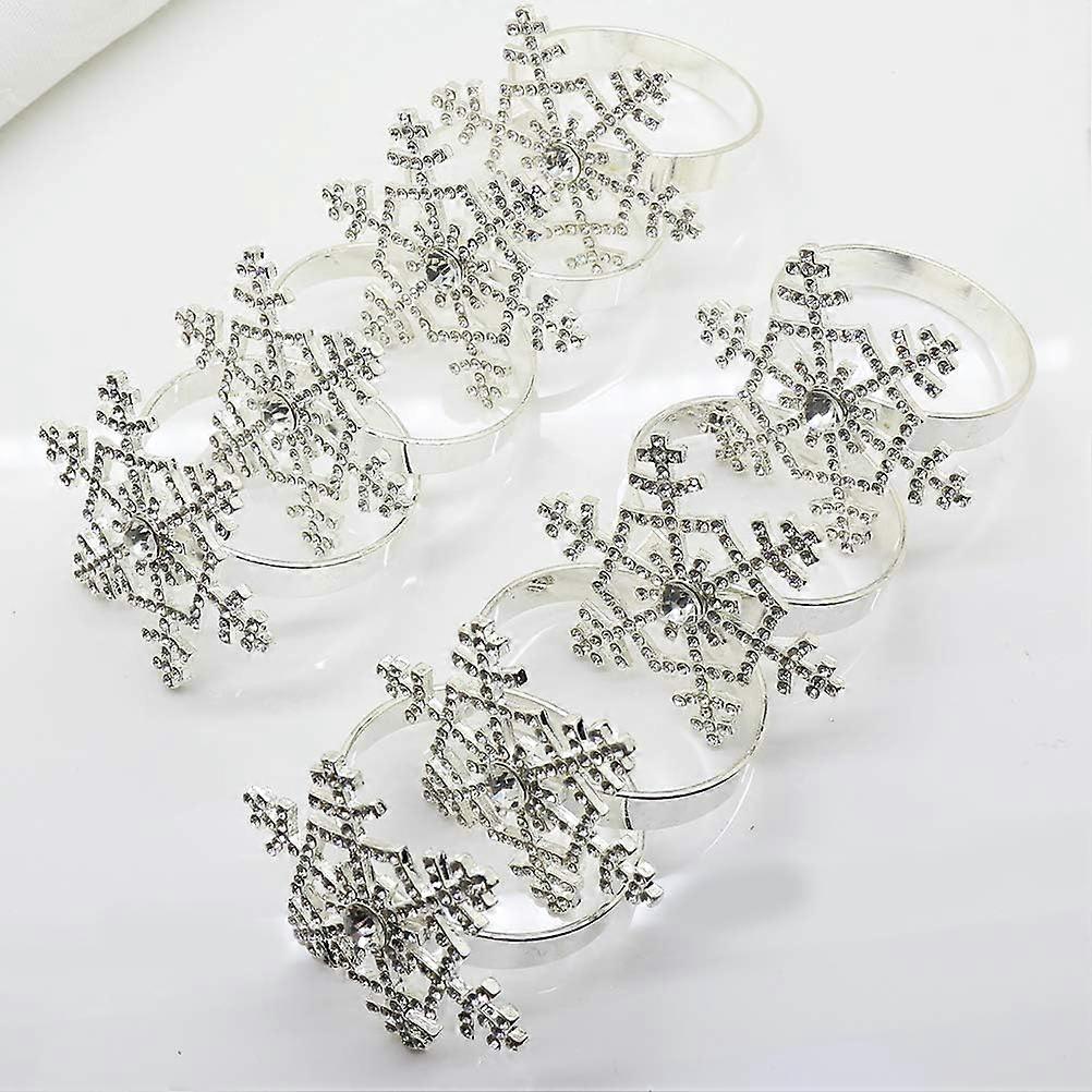 Set of 10 snowflake napkin rings with a 1.77 inches(4.5cm) diameter, made of zinc alloy, and will fit all cloth napkins. Silver snowflake shape napkin ring looks more cool and shine.The metal napkin rings can be reused many times after cleaning. Sturdy, mid-weight napkin rings. Dress your table top up for a formal affair or down for a casual gathering, add the finishing touch with napkin rings to complement your place settings. Create a lasting impression with these sparkling napkin rings to your bridal shower, wedding, christmas party an elegant dinner with sparkling bling. Note:instructions: wipe clean with a soft cloth. Keep the deer napkin ring holders off water. The exquisite napkin ring gives any occasion added appeal. The stylish napkin ring decorates your napkin beautifully. Add some beauty to your napkin and dinning table with this eye-catching rhinestone snowflake napkin ring. It combines beauty and practicaluse in one. Keep good mood with this stylish napkin ring when dinning. Specification Material:Alloy Color:Silver Size:Ring diameter:4.5cm/1.77".Snowflake diameter:2.16" Package:10 pcs rhinestone snowflake napkin rings