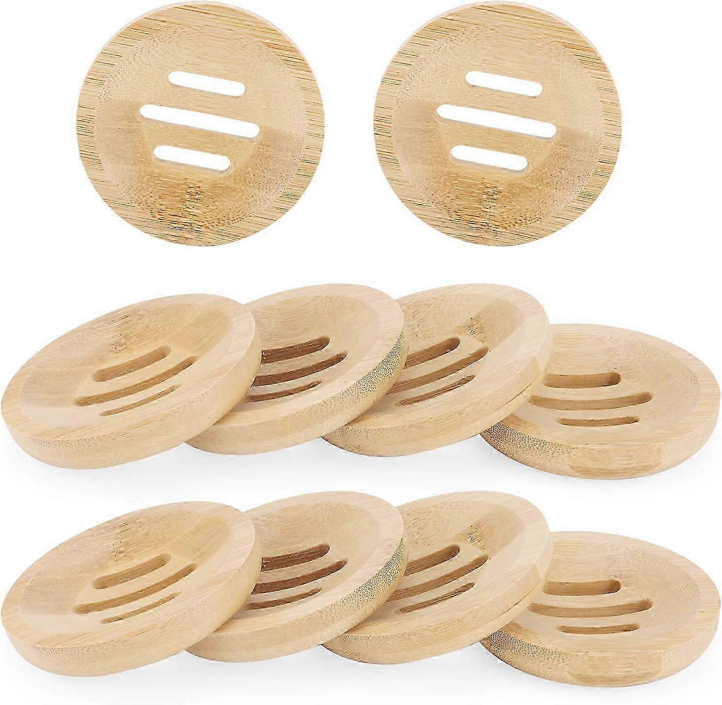 HARD BAMBOO MATERIAL: High-quality hard natural bamboo material has rustic original bamboo color, natural wood stripes, and tough texture. Our wooden soap dishes are made of natural bamboo material, which is beautiful, delicate, and durable.<br> UNIQUE DESIGN: Considering mostly used in humid environments, bamboo soap dishes especially adopt a slotted design in the middle, so that your soap dries faster to extend its service life and minimize the weight of the wood soap dish.<br> PACKING: You can get a total of 10 pieces of round wooden soap holders with a diameter of 8cm, which can perfectly place your soap. It is ideal for use in the kitchen or bathroom.<br> STABLE AND STURDY: These small soap dishes are designed with black round rubber feet at the bottom, so you don't have to worry about them slipping off when you put them on a smooth surface such as marble. They are practical bathroom trays, which can also be used to place your jewelry, small accessories, and so on.<br> HASSLE-FREE PURCHASE: We provide all customers with higher quality products and satisfactory shopping experience. Let us know if you find any quality issues after receiving the bamboo soap tray. We guarantee to offer a 30-day refund.