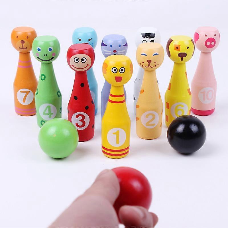 Wooden Bowling Set with 10 Pins and 3 Balls, Indoor and Outdoor Game for Kids 3-12 Years