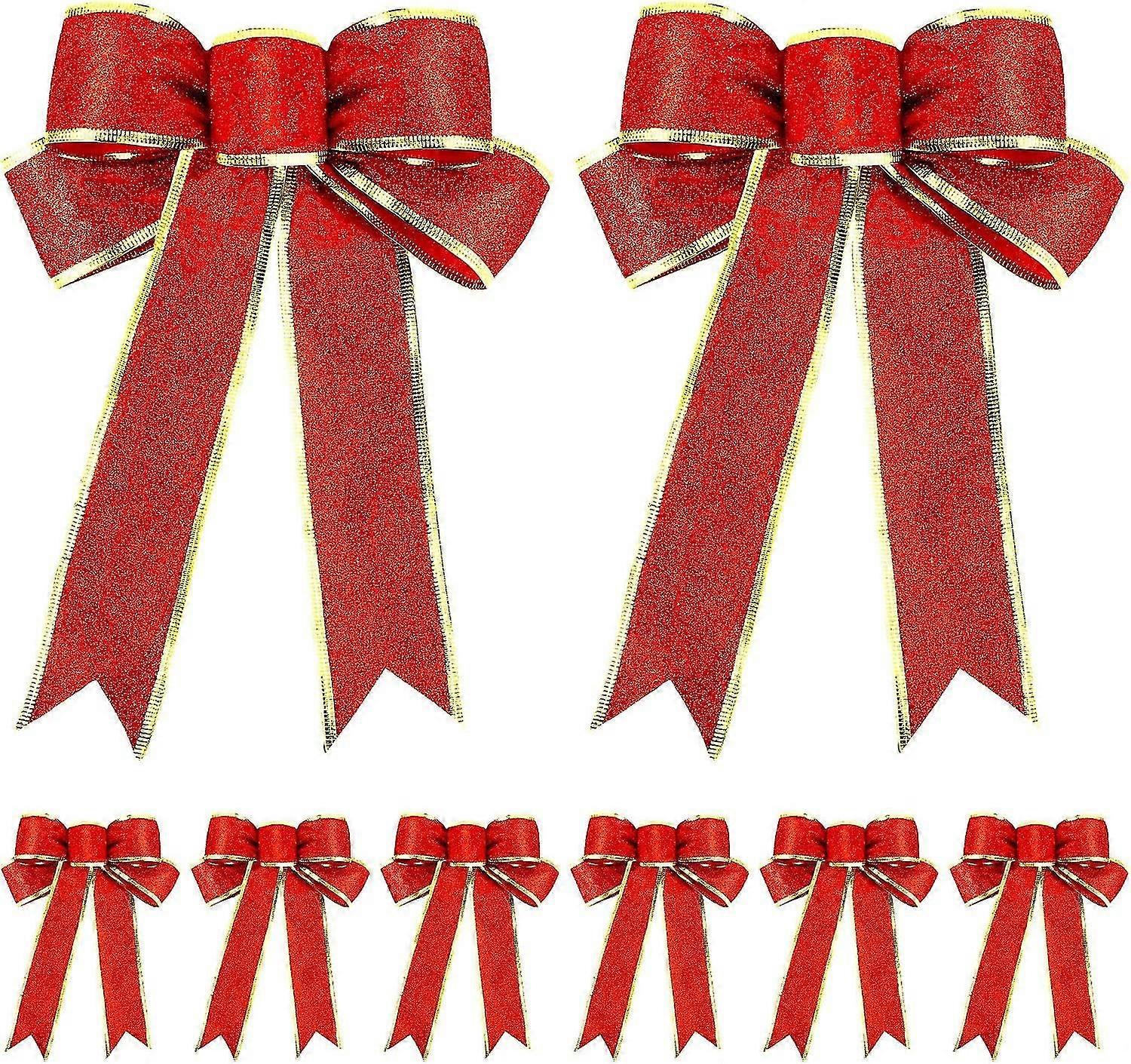 Package: includes 10 pieces glitter Christmas tree bows, large number provide for you to decorate Christmas tree, Wreaths, gift, door, windows, and so on ^Christmas tree decoration: the bow can provide a pleasure holiday with it's elegant 4 loop bow style design, vibrant color is very suitable for Christmas theme, bright and beautiful ^Wide usages: this is an essential for Christmas holly wreath decorations, it can be hung on doors, walls, windows, mantels and Christmas tree, add a touch of vitality to the Christmas party ^Quality material: the Christmas tree bow is made of glitter ribbon fabric, soft to touch and durable, with gold twist tie, easy for you to hang on; Tips: please make each loop full before use ^Proper size: the glitter ribbon bow measures approx. 10 x 8 inches, it is eye-catching for its large size, very easy for you to decorate