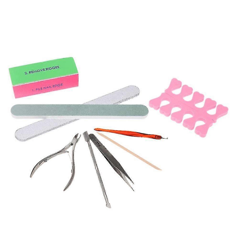 10Pcs Professional Nail Art Set Manicure Tools Kit Nail File Buffer Toe Finger Separator Cuticle Fork Pusher Nippers Tweezers Polishing Block Stick Features:_x005F_x000D_ Professional nail art tools set with a variety of necessary and high-quality tools._x005F_x000D_ Great for strengthening your nails and enhancing shine._x005F_x000D_ Small in size and light in weight make the set convenient to carry._x005F_x000D_ Ideal for both professional and personal use._x005F_x000D_ Perfect gift for girls who are interested in nail art._x005F_x000D_ Note:_x005F_x000D_ Colors of the items will be sent at random, pls in kind prevail _x005F_x000D_ Specifications:_x005F_x000D_ Stick Length: 11.3cm / 4.5in_x005F_x000D_ Tweezers Length: 11cm / 4.3in_x005F_x000D_ Cuticle Fork Length 11cm / 4.3in_x005F_x000D_ Cuticle Pusher Length: 13cm / 5.1in_x005F_x000D_ Cuticle Nippers Length9.5cm / 3.7in_x005F_x000D_ Buffer Size: Approx. 18 * 2 * 0.7cm / 7.1 * 0.8 * 0.3in_x005F_x000D_ Nail File Size: Approx. 18 * 2 * 0.4cm / 7.1 * 0.8 * 0.2in_x005F_x000D_ Separator Size(1pc): 9.5 * 3.2 * 0.6cm / 3.7 * 1.3 * 0.2in_x005F_x000D_ Polishing Block Size: Approx. 9 * 3.3 * 2.8cm / 3.5 * 1.3 * 1.1in_x005F_x000D_ Package Size: 25.5 * 17.5 * 3cm / 10 * 6.9 * 1.2in_x005F_x000D_ Package Weight: 85g / 3oz_x005F_x000D_ Package List:_x005F_x000D_ 2 * Separators_x005F_x000D_ 1 * Nail File_x005F_x000D_ 1 * Buffer_x005F_x000D_ 1 * Polishing Block_x005F_x000D_ 1 * Pair of Cuticle Nippers_x005F_x000D_ 1 * Cuticle Fork_x005F_x000D_ 1 * Cuticle Pusher_x005F_x000D_ 1 * Pair of Tweezers_x005F_x000D_ 1 * Stick