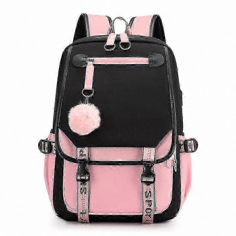 SIZE: 18.11"(H) x 11.42"(L) x 6.3"(W) / 46cm x 29cm x 16cm, weight 0.65kg. Material: Made of high-quality polyester, durable and water-resistant. Feature: Unique and colorful design with plush ball trinkets, making this backpack more attractive. Large capacity can fit a 16-inch laptop. How to charge your phone: The backpack is equipped with one USB port that connects your device on the outside to your own charging bank placed inside. Occasions: Suitable for teenage girls for school, shopping, dating, traveling, camping, driving, and more. Can be used as a school bag, everyday pack, or casual rucksack. Recommended Age: 5-20 years.
