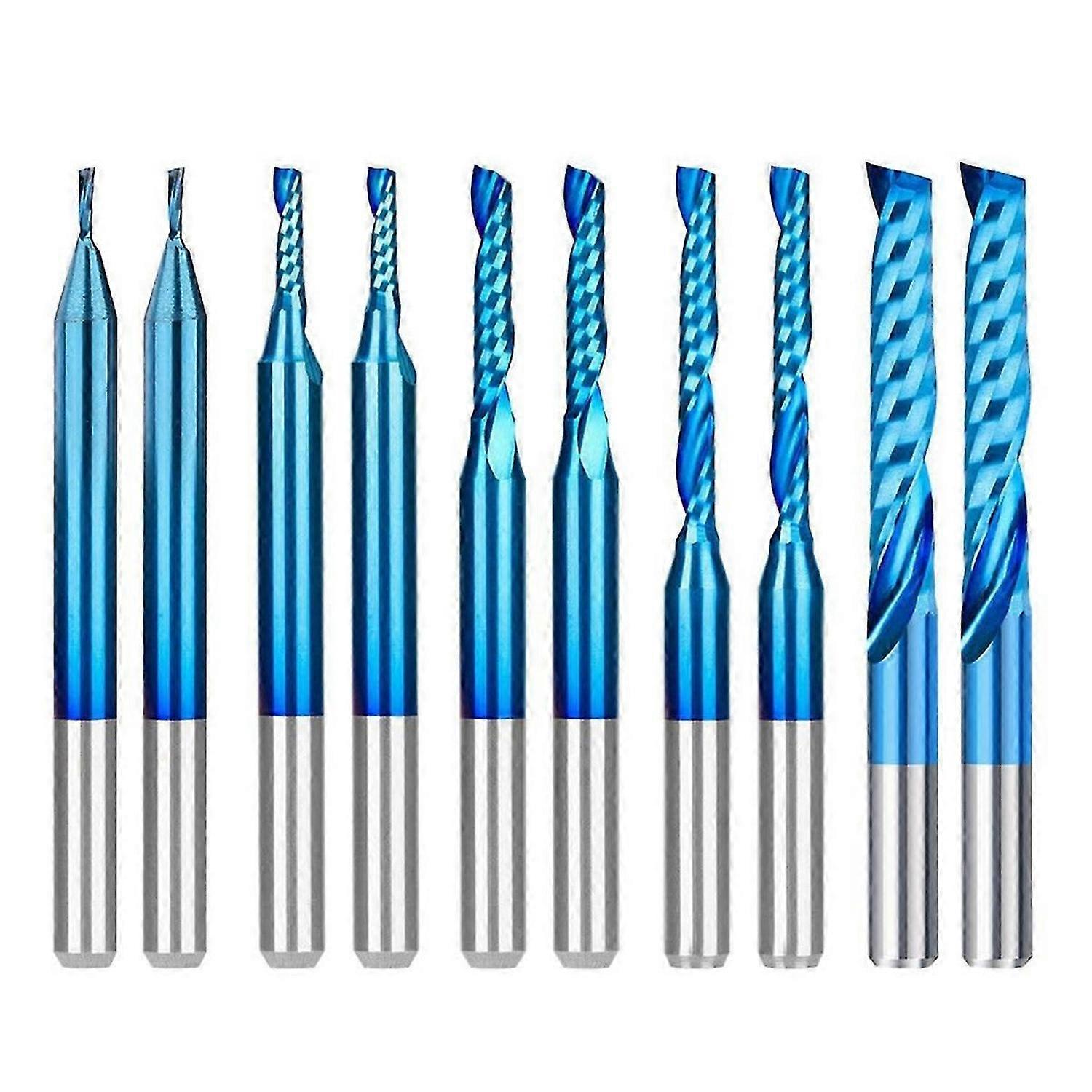 This carbide end mill set includes 10 pieces with a 1/8 inch shank,1x4mm 1.5x6mm 2x12mm 2.5x17mm 3.175x22mm Each 2pcs Solid carbide up cut router bits,O-Flute spiral bits used for smoothly upcut groove and slots Our end mills feature a nano-blue coating for enhanced hardness,wear resistance,and excellent cutting performance.ensure high work efficiency Suitable for a variety of materials, acrylic, plastic, aluminum, copper, and wood; Used for Carving, Cutting, Slotting, Milling, Hollow Cutting Ideal for woodworking projects, DIY crafts.Perfect for CNC routing, hobbyist projects, and sign making with plastic and non-ferrous materials.<br><br>Colour:As Shown Material:Tungsten steel<br><br>Package Contents: 1 set * 1/4 upcut spiral router bit<br><br>Only the above package content, other products are not included. Note: Light reflection and different displays may cause the color of the item in the picture a little different from the real thing. The measurement allowed error is +/- 1-3cm.