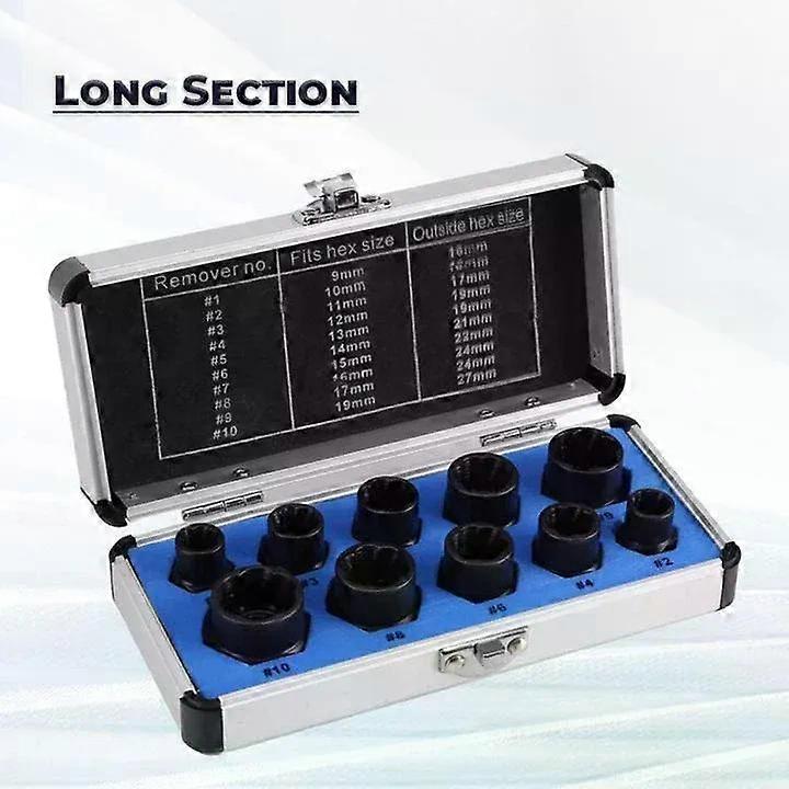 * Maximum Impact Bolt/Extractor Remover: The kit is the ideal tool kit for removing stripped, rounded, painted and rusted bolts and nuts.* Multi-function: 3/8" impact square drive that can be used with air ratchets, impact wrenches and hand ratchets, it also has hexagonal flats for use with flat wrench, pliers, adjustable wrench, sockets or VISE-GRIP collet pliers.* High Quality Construction: From an impact rated 6-point high carbon steel (chrome-molybdenum steel) that provides excellent durability, corrosion resistance and maximum gripping power. Plus the bonus of laser-etched markings on all slots for easy visibility.* Wide Range of Slots for All Types of Jobs: 10 sizes of slots make it the perfect tool kit for all types of applications. The sockets operate on SAE-1/4", 5/16", 3/8", 7/16", 1/2", 9/16", 5/8", 11/16" and 3/4" sizes. The sockets operate on metric sizes - 8mm, 10mm, 11mm, 12mm, 13mm, 14mm, 16mm, 17mm and 19mm.* Color: Black.* Fits head sizes: 9, 10, 11, 12, 13, 14, 15, 16, 17 and 19mm.* Material: Chrome vanadium alloy steel.* Package Included: 1 x Nut Remover.* Particularly hardened sockets with corrosion protection.* Designed to remove damaged screws, bolts and nuts.* Anti-slip broken studs rounded screws.* The spiral design of the socket allows for secure connection to the rounded clasp to be pulled out.* Can be used with impact guns or air breakers and reversible ratchets.* Simply place the socket on damaged or rounded nuts and bolt and rotate with an impact gun.* The handle on the connector tightens when more torque is applied.* Comes with a handy storage case (optional). Notes:* Due to the different monitor and light effect, the actual color of the item may be slightly different from the color showed on the pictures.