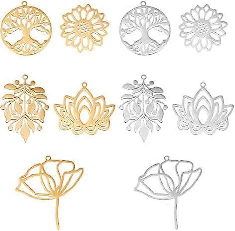 10Pcs 5 Style Stainless Steel Pendants Lotus Flower and Leaf Charms Hypoallergenic Flat Round with Tree of Life Charms for Bracelet Necklace Jewelry M