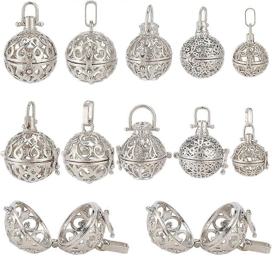 10Pcs 5 Styles Rack Plating Brass Cage Pendants For Chime Ball Pendant Necklaces Making Hollow Round Platinum 26~29x25.5~26x21~21.5mm Hole: 3~9x4~8mm