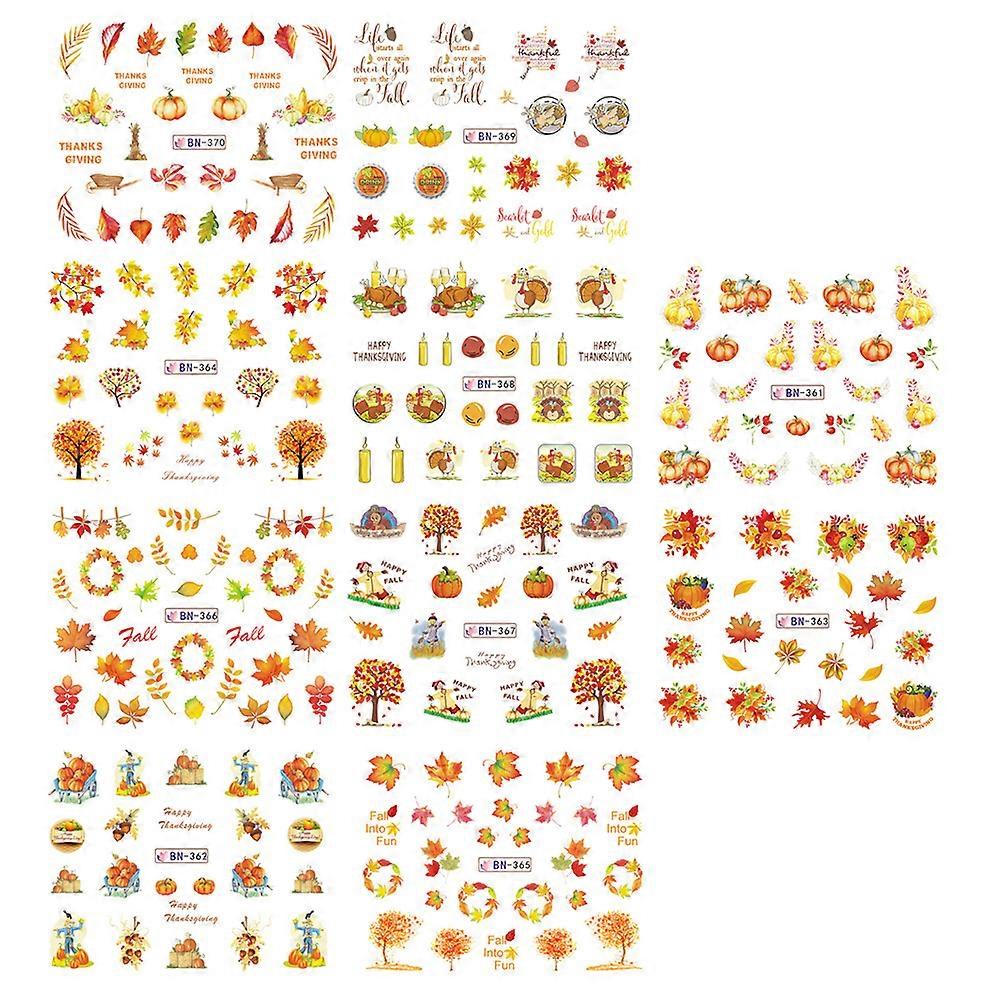 10 Sheets Thanksgiving Theme Nail Art Stickers DIY Fall Maple Leaf Pumpkin Harvest Self-Adhesive Nail Stickers