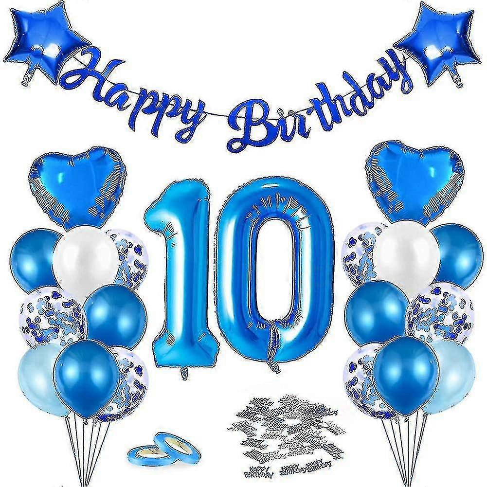 10 year old boy birthday decoration: blue 10 foil balloon (81 cm), 24 latex balloons (1x blue, 1x light blue, 1x white, 1x confetti), 2x star balloons, 2x balloon ribbons, 1x birthday banner , 10gx confetti. . High quality latex balloons and foil balloons that are suitable for air and helium can be reused. . 1-10 years to choose, meet boys of different ages, organize a unique blue theme party, create your own happy memories. . Combine with latex balloons and self-arresting ribbon to create a foil balloon bouquet or table decoration. Everyone will love it, your guests will be impressed. Installation: Carefully insert the straw into the plastic valve at the end of the balloon, fill it slowly and squeeze the bottom of the foil balloon firmly. .