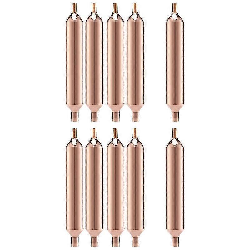 Molecular sieve drying filter is one of the five major components in the refrigeration system. The dehydration and drying of the refrigerant and the filtration of impurities can avoid ice clogging and dirty clogging in the refrigerant cycle, so that the refrigeration machine can operate normally.<br> The structure of the filter drier is made of copper tubes through circular arc spinning, the molecular sieve is built in to absorb water for drying, and the filter nets are installed at both ends. The quality of the filter drier directly affects the life of the refrigeration system and the freezing effect.<br> Material: Copper<br> Dimensions: 115 x18mm<br> Quantity: 10<br> color:Brass<br> Package Contents:<br> 10 * Refrigeration accessories<br> Only the above package content, other products are not included.<br> Note: Light shooting and different displays may cause the color of the item in the picture a little different from the real thing. The measurement allowed error is +/- 1-3cm.