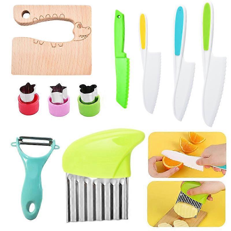 10 PCS Kids Kitchen Knife Set, Wooden Kids Knife Safe Knives for Real Cooking Serrated Edges Children Cooking Utensils Tools Plastic Knife for Toddler