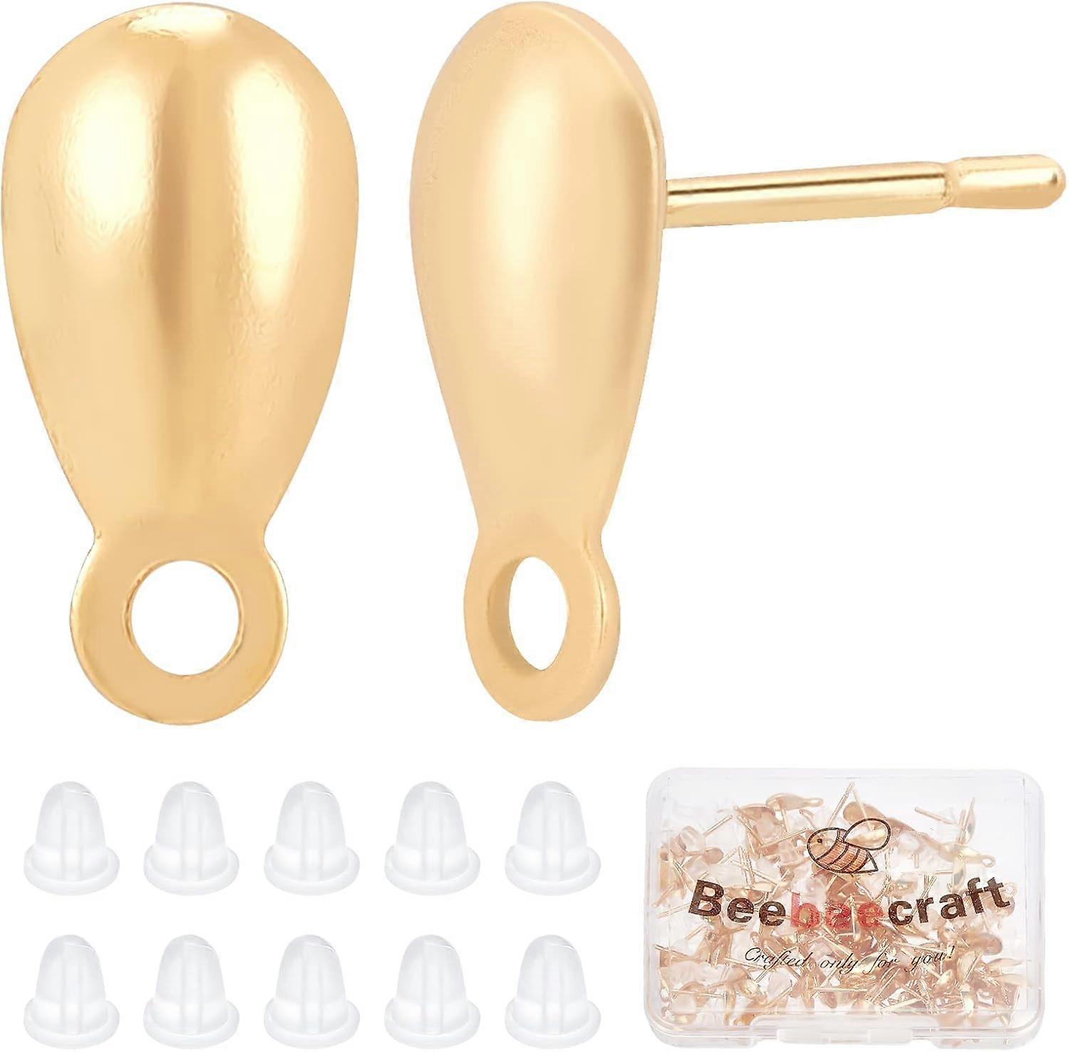 100Pcs/Box 18K Gold Plated Earring Findings Teardrop Posts Stud Earrings Components with Loop and 100Pcs Plastic Earring Backs for DIY Earring Jewelry