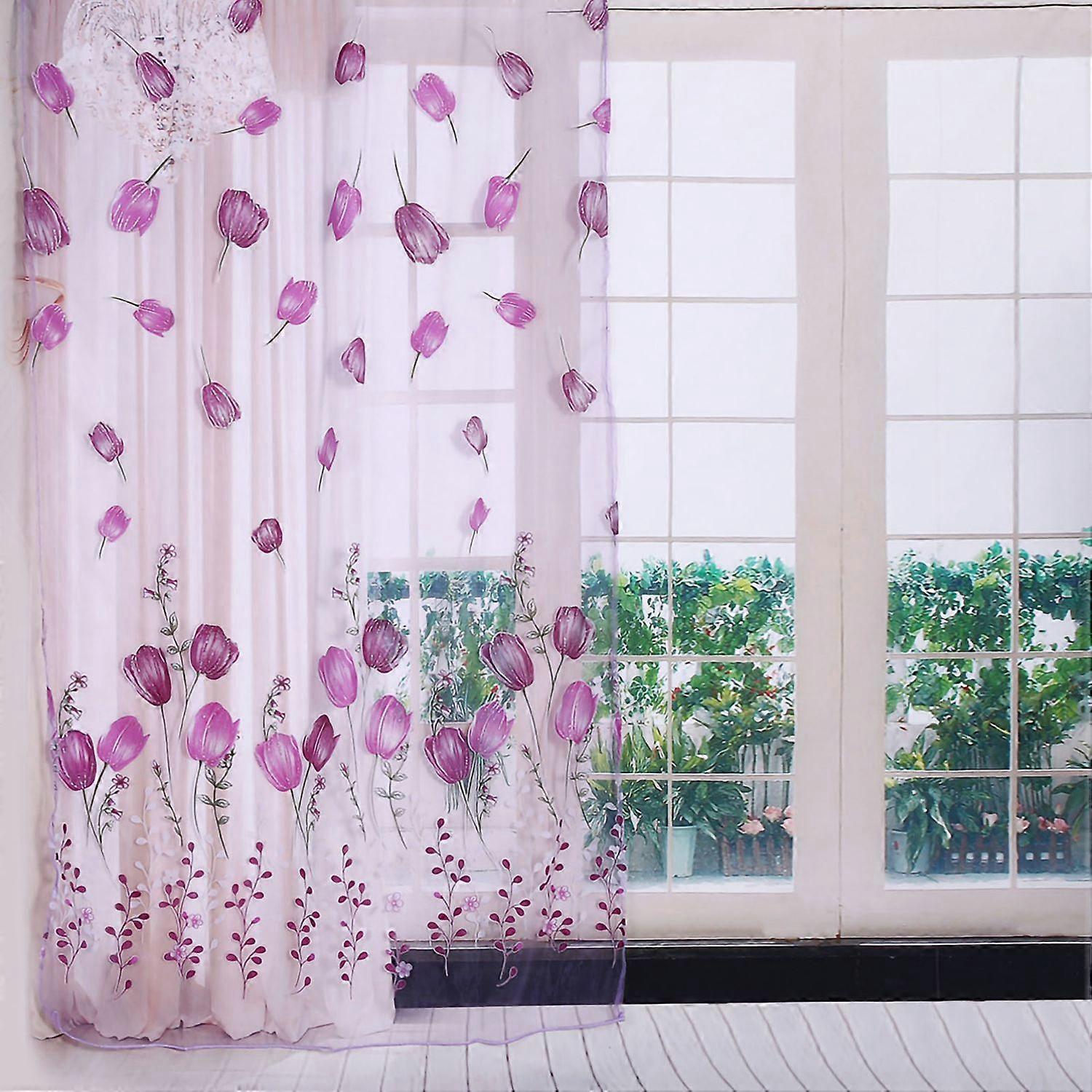 100*200cm Tulips Printing Tulle Curtains Sheer Drape Balcony Window Decoration Purple