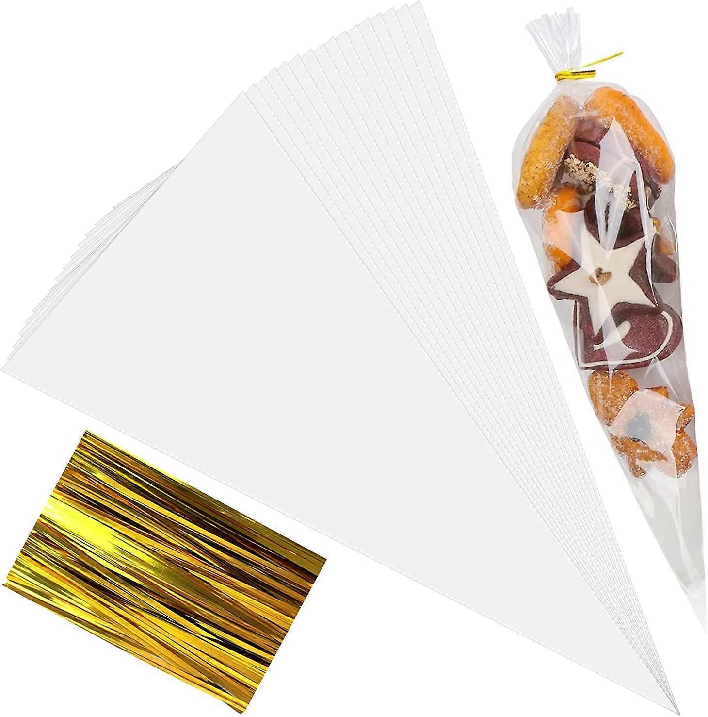100 Pcs Cone Bags Cone Treat Bag 5" X 10" Clear Cello Bags for Popcorn Candy Cookies with 100 Twist Ties