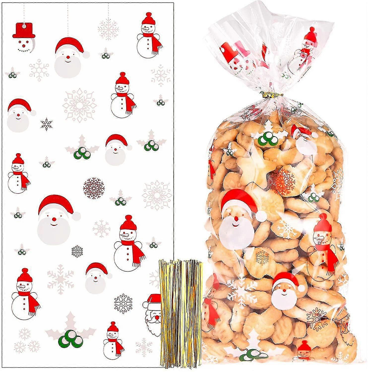 100pcs Christmas Candy Cookie Bags, Clear Plastic Christmas Gift Bags With 100pcs Twisted Ties For Christmas Party A