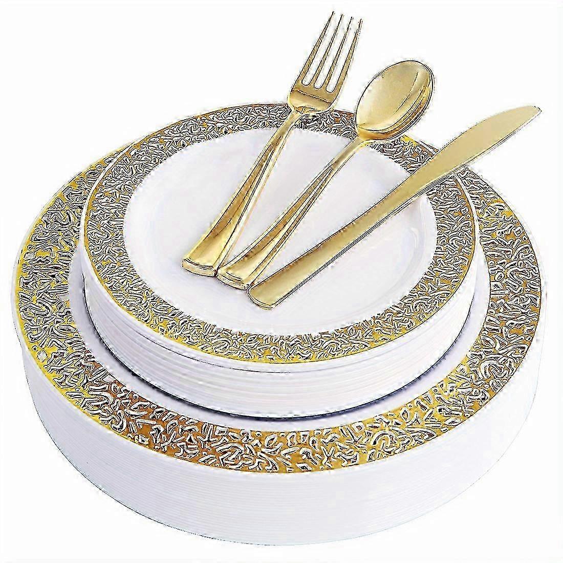 100pcs Disposable Plastic Plates with Golden Cutlery Set, Dinner & Salad Plates