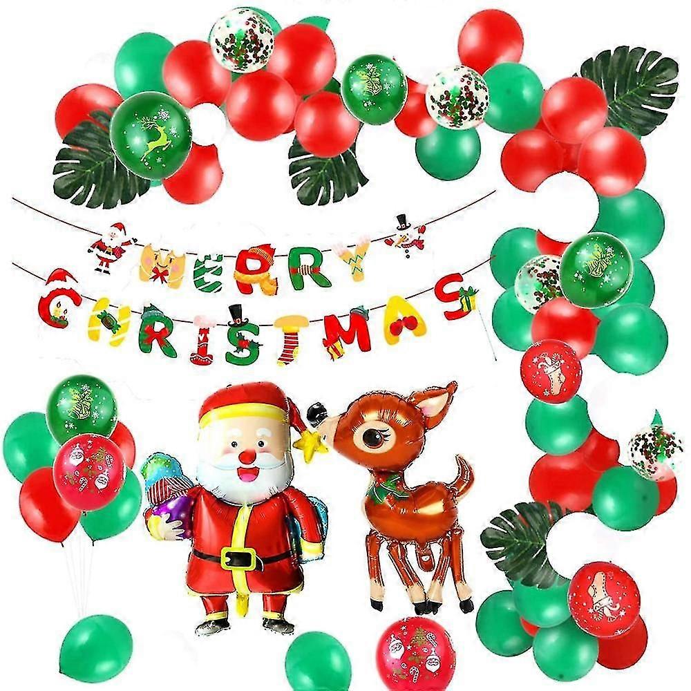 PREMIUM MATERIAL: and Santa Balloons are made of high quality emulsion material with self-sealing valve.The balloon is made of high-quality latex, which is sturdy and durable, weighs up to 3g, is absolutely harmless to the human body, and is a biodegradable material that will not pollute the environment.Rugged and durable, it supports helium or .EASY TO ASSEMBLE: This pack includes balloon strips and glue to make various types of balloon arches and garlands.First, inflate the balloons, then put the knots of the balloons into the balloon tape holes, one by one, you can glue the balloons to a one, they will be nice decorations.Christmas themed balloons are party, you can them from the ceiling, on the wall or on the window.Make balloons as an arch garland as a party background, a number of balloons have many decoration possibilities for an unforgettable and special Christmas party.Create a Christmas Mood: These Santa Balloons are Christmas-themed and perfect for decorating a Christmas party and creating a festive mood.Quick Assembly: The first step is to blow balloons of different shapes and sizes.In the second step, insert them into the plastic strips that make the garland.The third step is to the balloon garland in the shape you like.In just 30 minutes, you will have a beautiful Christmas balloon garland party backdrop.packinglist:1 pull flag, 1 Santa Claus, 1 deer, 3 red balloons each for two types of Christmas, 3 each for two types of green Christmas, 4 red and green sequins, 4 turtle leaves, 10 inch light green 30, 10 30 inch red, 20 10 inch white, 1 dispensing, 1 balloon chain, 1 knotter, 1 ribbonColour:As shownMaterial:emulsionPackage Contents:107 x Christmas Merry Christmas Balloon SetOnly the above package content, other products are not included.Note:Light reflection and different displays may cause the color of the item in the picture a little different from the real thing.The measurement allowed error is +/- 1-3cm.