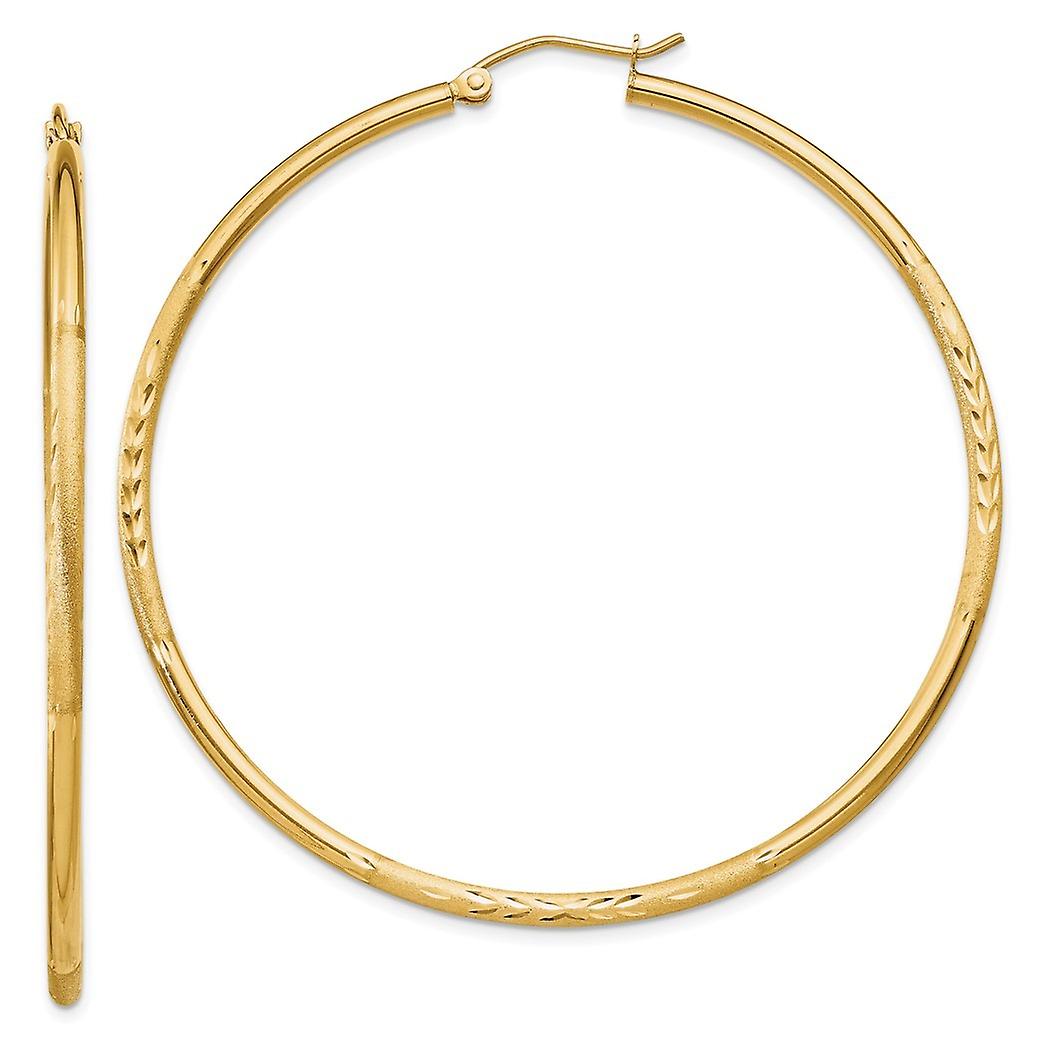 10k Solid Yellow Gold Satin and Sparkle Cut 2mm Round Tube Hoop Earrings 55mm Long 2mm Thick-Hoop Earring for Women